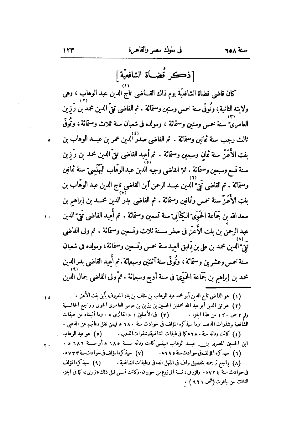 كان قاضى قضاة الشافعيّة يوم ذاك القاضى تاج «1» الدين عبد الوهاب، وهى ولايته الثانية؛ وتوفّى سنة خمس وستين وستمائة. ثم القاضى تقىّ الدين محمد «2» بن رزين العامرىّ «3» سنة خمس وستين وستمائة، ومولده فى شعبان سنة ثلاث وستمائة، وتوفّى ثالث رجب سنة ثمانين وستمائة. ثم القاضى صدر «4» الدين عمر بن عبد الوهاب بن بنت الأعزّ سنة ثمان وسبعين وستمائة. ثم أعيد القاضى تقىّ الدين محمد بن رزين سنة تسع وسبعين وستمائة. ثمّ القاضى وجيه «5» الدين عبد الوهّاب البهنسىّ سنة ثمانين وستمائة. ثم القاضى تقىّ «6» الدين عبد الرحمن ابن القاضى تاج الدين عبد الوهّاب بن بنت الأعزّ سنة خمس وثمانين وستمائة. ثم القاضى بدر «7» الدين محمد بن إبراهيم بن سعد الله بن جماعة الحموىّ الكنانىّ سنة تسعين وستمائة. ثم أعيد القاضى تقىّ الدين عبد الرحمن بن بنت الأعزّ فى صفر سنة ثلاث وتسعين وستمائة. ثم ولى القاضى تقىّ «8» الدين محمد بن على بن دقيق العيد سنة خمس وتسعين وستمائة، ومولده فى شعبان سنة خمس وعشرين وستمائة، وتوفّى سنة اثنتين وسبعمائة. ثم أعيد القاضى بدر الدين محمد بن إبراهيم بن جماعة الحموىّ فى سنة أربع وسبعمائة. ثمّ ولى القاضى جمال «9» الدين