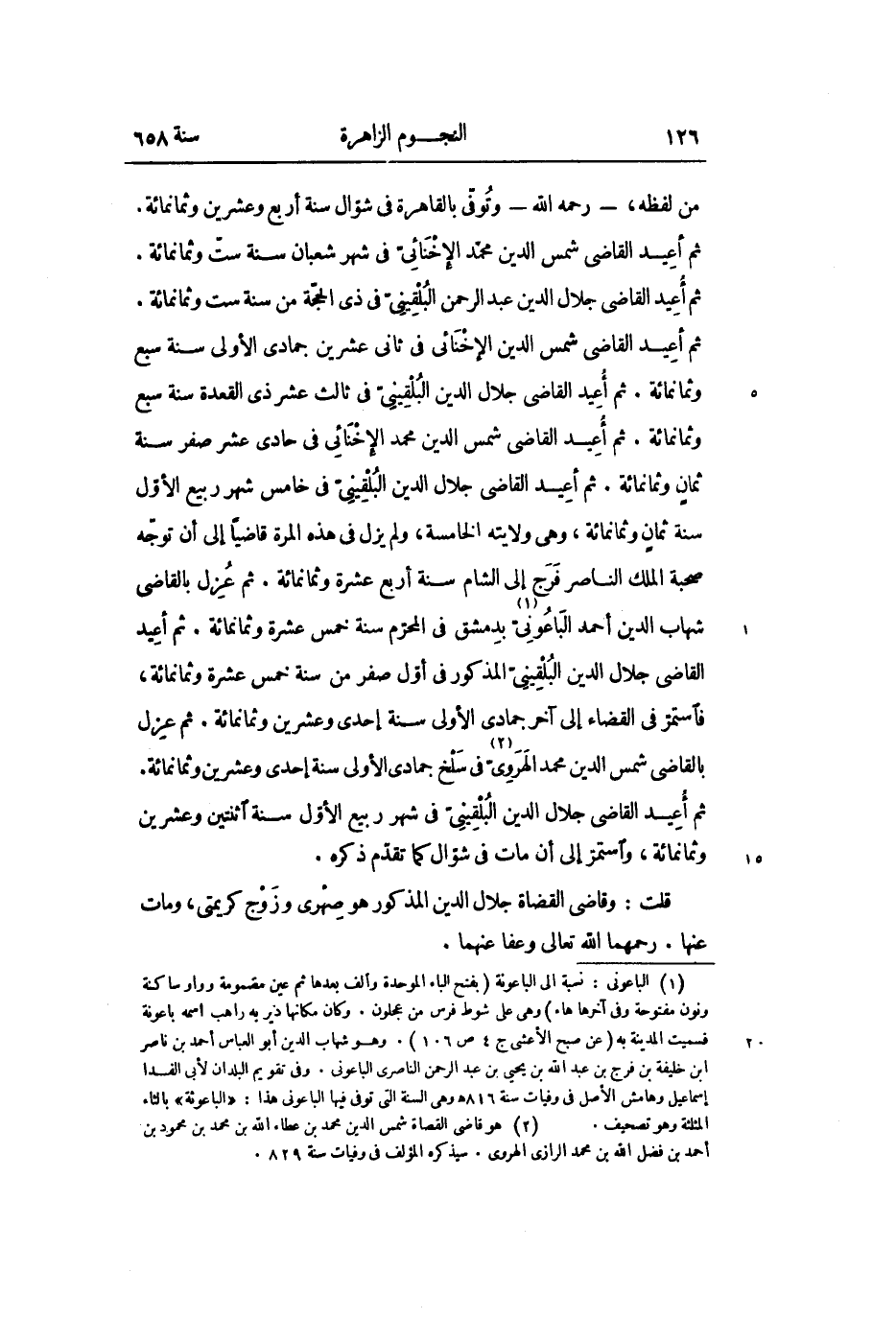 ثم أعيد القاضى شمس الدين الإخنائى فى ثانى عشرين جمادى الأولى سنة سبع وثمانمائة. ثم أعيد القاضى جلال الدين البلقينىّ فى ثالث عشر ذى القعدة سنة سبع وثمانمائة. ثم أعيد القاضى شمس الدين محمد الإخنائى فى حادى عشر صفر سنة ثمان وثمانمائة. ثم أعيد القاضى جلال الدين البلقينىّ فى خامس شهر ربيع الأوّل سنة ثمان وثمانمائة، وهى ولايته الخامسة، ولم يزل فى هذه المرة قاضيا إلى أن توجّه صحبة الملك الناصر فرج إلى الشام سنة أربع عشرة وثمانمائة. ثم عزل بالقاضى شهاب الدين أحمد الباعونىّ «1» بدمشق فى المحرّم سنة خمس عشرة وثمانمائة. ثم أعيد القاضى جلال الدين البلقينىّ المذكور فى أوّل صفر من سنة خمس عشرة وثمانمائة، فاستمرّ فى القضاء إلى آخر جمادى الأولى سنة إحدى وعشرين وثمانمائة. ثم عزل بالقاضى شمس الدين محمد الهروىّ «2» فى سلخ جمادى الأولى سنة إحدى وعشرين وثمانمائة.