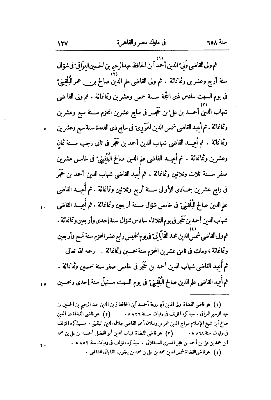 ثم ولى القاضى ولىّ الدين أحمد «1» ابن الحافظ عبد الرحيم بن الحسين العراقىّ فى شوّال سنة أربع وعشرين وثمانمائة. ثم ولى القاضى علم الدين «2» صالح بن عمر البلقينىّ فى يوم السبت سادس ذى الحجّة سنة خمس وعشرين وثمانمائة. ثم ولى القاضى شهاب الدين «3» أحمد بن علىّ بن حجر فى سابع عشرين المحرّم سنة سبع وعشرين وثمانمائة. ثم أعيد القاضى شمس الدين الهروىّ فى سابع ذى القعدة سنة سبع وعشرين وثمانمائة. ثم أعيد القاضى شهاب الدين أحمد بن حجر فى ثانى رجب سنة ثمان وعشرين وثمانمائة. ثم أعيد القاضى علم الدين صالح البلقينىّ فى خامس عشرين صفر سنة ثلاث وثلاثين وثمانمائة. ثم أعيد القاضى شهاب الدين أحمد بن حجر فى رابع عشرين جمادى الأولى سنة أربع وثلاثين وثمانمائة. ثم أعيد القاضى علم الدين صالح البلقينىّ فى خامس شوّال سنة أربعين وثمانمائة. ثم أعيد القاضى شهاب الدين أحمد بن حجر فى يوم الثلاثاء سادس شوّال سنة إحدى وأربعين وثمانمائة.