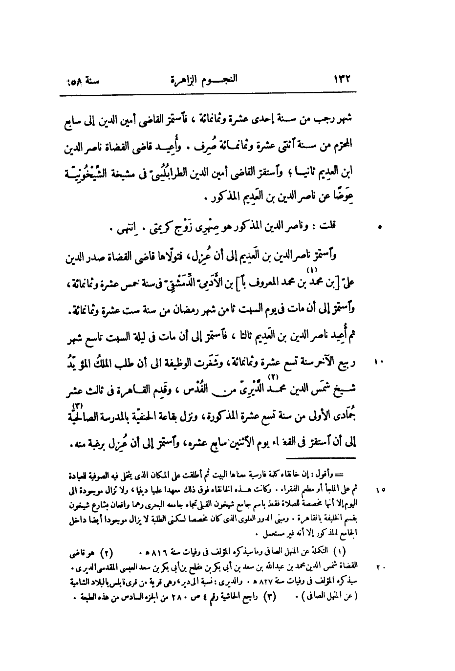 ثم أعيد ناصر الدين بن العديم ثالثا، فاستمرّ إلى أن مات فى ليلة السبت تاسع شهر ربيع الآخر سنة تسع عشرة وثمانمائة، وشغرت الوظيفة الى أن طلب الملك المؤيّد شيخ شمس الدين محمد «2» الدّيرىّ من القدس، وقدم القاهرة فى ثالث عشر جمادى الأولى من سنة تسع عشرة المذكورة، ونزل بقاعة الحنفيّة بالمدرسة الصالحيّة «3» إلى أن استقرّ فى القضاء يوم الاثنين سابع عشره، واستمرّ إلى أن عزل برغبة منه.