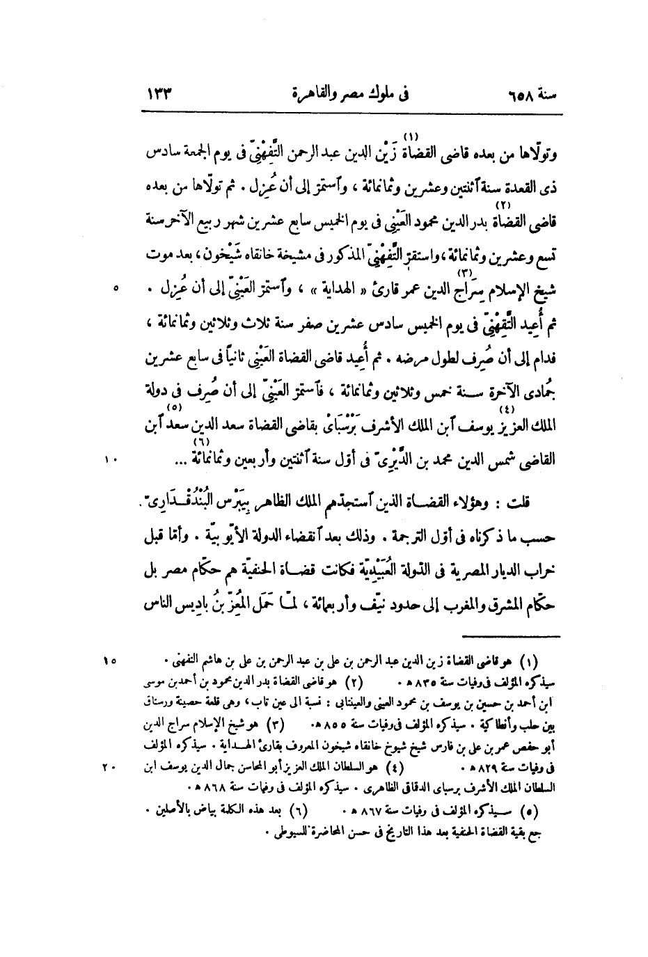 ثم أعيد التّقهنىّ فى يوم الخميس سادس عشرين صفر سنة ثلاث وثلاثين وثمانمائة، فدام إلى أن صرف لطول مرضه. ثم أعيد قاضى القضاة العينى ثانيا فى سابع عشرين جمادى الآخرة سنة خمس وثلاثين وثمانمائة، فاستمرّ العينىّ إلى أن صرف فى دولة الملك العزيز «4» يوسف ابن الملك الأشرف برسباى بقاضى القضاة سعد الدين سعد «5» ابن القاضى شمس الدين محمد بن الدّيرىّ فى أوّل سنة اثنتين وأربعين وثمانمائة «6» ...