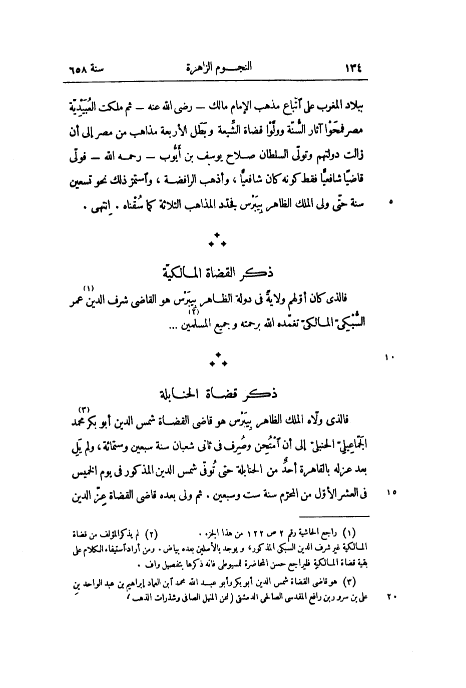 ببلاد المغرب على اتّباع مذهب الإمام مالك- رضى الله عنه- ثم ملكت العبيديّة مصر فمحوا آثار السّنّة وولّوا قضاة الشّيعة وبطل الأربعة مذاهب من مصر إلى أن زالت دولتهم وتولّى السلطان صلاح يوسف بن أيّوب- رحمه الله- فولّى قاضيا شافعيّا فقط كونه كان شافعيّا، وأذهب الرافضة، واستمرّ ذلك نحو تسعين سنة حتّى ولى الملك الظاهر بيبرس فجدّد المذاهب الثلاثة كما سقناه. انتهى.