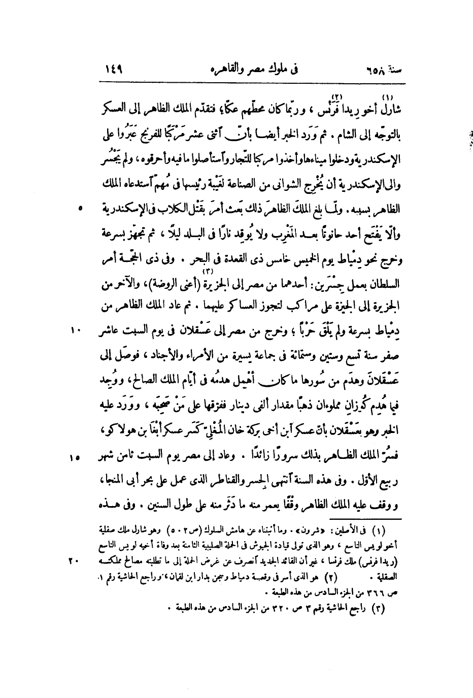 شارل «1» أخو ريدا «2» فرنس، وربّما كان محطّهم عكّا؛ فتقدّم الملك الظاهر إلى العسكر بالتوجّه إلى الشام. ثم ورد الخبر أيضا بأنّ اثنى عشر مركبا للفرنج عبروا على الإسكندرية ودخلوا ميناءها وأخذوا مركبا للتّجار واستأصلوا ما فيه وأحرقوه، ولم يجسر والى الإسكندرية أن يخرج الشوانى من الصناعة لغيبة رئيسها فى مهمّ استدعاه الملك الظاهر بسببه. ولمّا بلغ الملك الظاهر ذلك بعث أمر بقتل الكلاب فى الإسكندرية وألّا يفتح أحد حانوتا بعد المغرب ولا يوقد نارا فى البلد ليلا، ثم تجهّز بسرعة وخرج نحو دمياط يوم الخميس خامس ذى القعدة فى البحر. وفى ذى الحجّة أمر السلطان بعمل جسرين: أحدهما من مصر إلى الجزيرة «3» (أعنى الروضة) ، والآخر من الجزيرة إلى الجيزة على مراكب لتجوز العساكر عليهما. ثم عاد الملك الظاهر من دمياط بسرعة ولم يلق حربا؛ وخرج من مصر إلى عسقلان فى يوم السبت عاشر صفر سنة تسع وستين وستمائة فى جماعة يسيرة من الأمراء والأجناد، فوصل إلى عسقلان وهدم من سورها ما كان أهمل هدمه فى أيّام الملك الصالح، ووجد فيما هدم كوزان مملوءان ذهبا مقدار ألفى دينار ففرّقها على من صحبه، وورد عليه الخبر وهو بعسقلان بأنّ عسكر ابن أخى بركة خان المغلىّ كسر عسكر أبغا بن هولاكو، فسرّ الملك الظاهر بذلك سرورا زائدا. وعاد إلى مصر يوم السبت ثامن شهر ربيع الأوّل. وفى هذه السنة انتهى الجسر والقناطر الذي عمل على بحر أبى المنجا، ووقف عليه الملك الظاهر وقفا يعمر منه ما دثر منه على طول السنين. وفى هذه