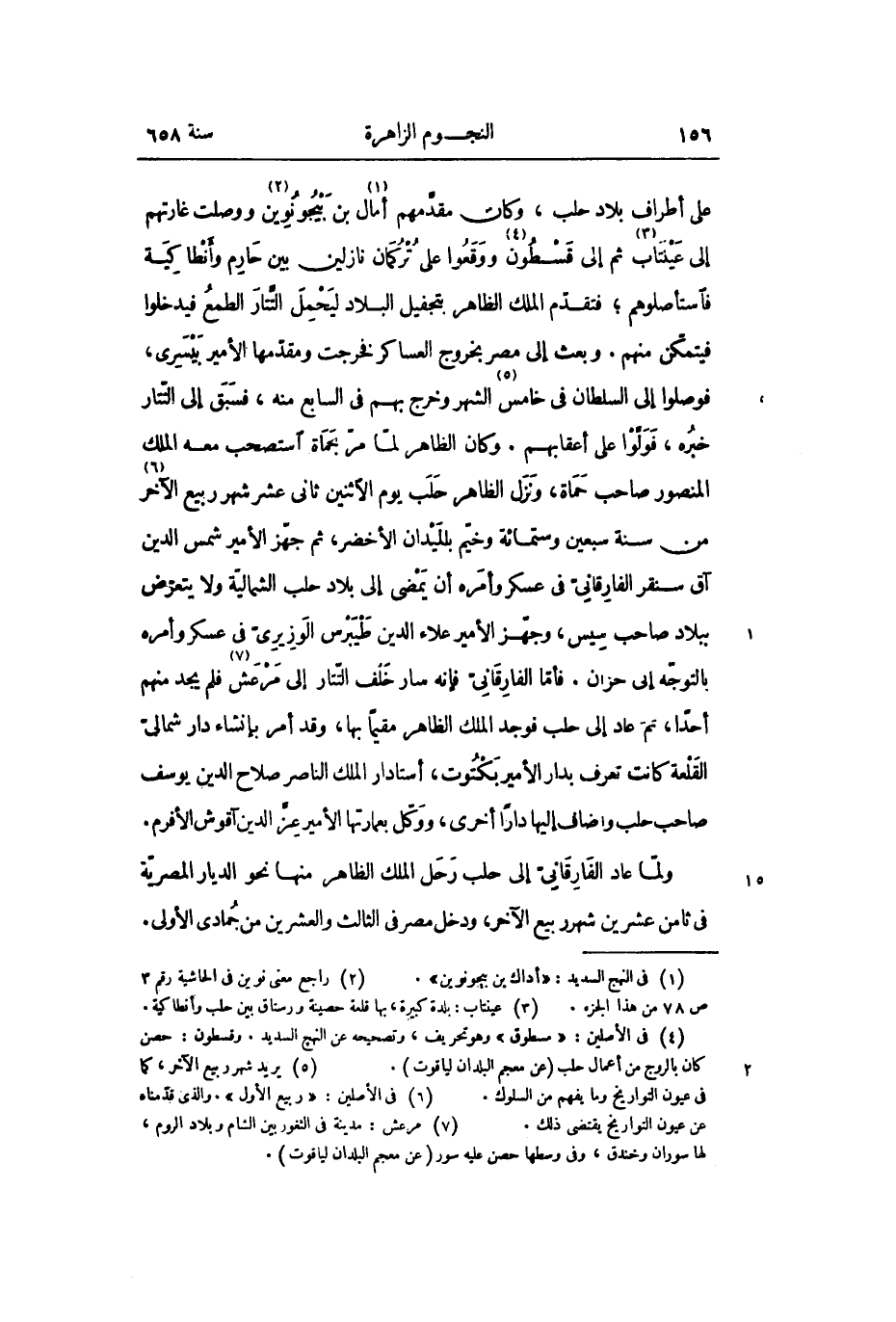 على أطراف بلاد حلب، وكان مقدّمهم أمال «1» بن بيجونوين «2» ووصلت غارتهم إلى عينتاب «3» ثم إلى قسطون «4» ووقعوا على تركمان نازلين بين حارم وأنطاكية فاستأصلوهم؛ فتقدّم الملك الظاهر بتجفيل البلاد ليحمل التّتار الطمع فيدخلوا فيتمكّن منهم. وبعث إلى مصر بخروج العساكر فخرجت ومقدّمها الأمير بيسرى، فوصلوا إلى السلطان فى خامس «5» الشهر وخرج بهم فى السابع منه، فسبق إلى التّتار خبره، فولّوا على أعقابهم. وكان الظاهر لمّا مرّ بحماة استصحب معه الملك المنصور صاحب حماة، ونزل الظاهر حلب يوم الاثنين ثانى عشر شهر ربيع الآخر «6» من سنة سبعين وستمائة وخيّم بلليدان الأخضر، ثم جهّز الأمير شمس الدين آق سنقر الفارقانىّ فى عسكر وأمره أن يمضى إلى بلاد حلب الشماليّة ولا يتعرّض ببلاد صاحب سيس، وجهّز الأمير علاء الدين طيبرس الوزيرىّ فى عسكر وأمره بالتوجّه إلى حرّان. فأمّا الفارقانىّ فإنه سار خلف التّتار إلى مرعش «7» فلم يجد منهم أحدا، تم عاد إلى حلب فوجد الملك الظاهر مقيما بها، وقد أمر بإنشاء دار شمالىّ القلعة كانت تعرف بدار الأمير بكتوت، أستادار الملك الناصر صلاح الدين يوسف صاحب حلب واضاف إليها دارا أخرى، ووكّل بعمارتها الأمير عزّ الدين آقوش الأفرم.
