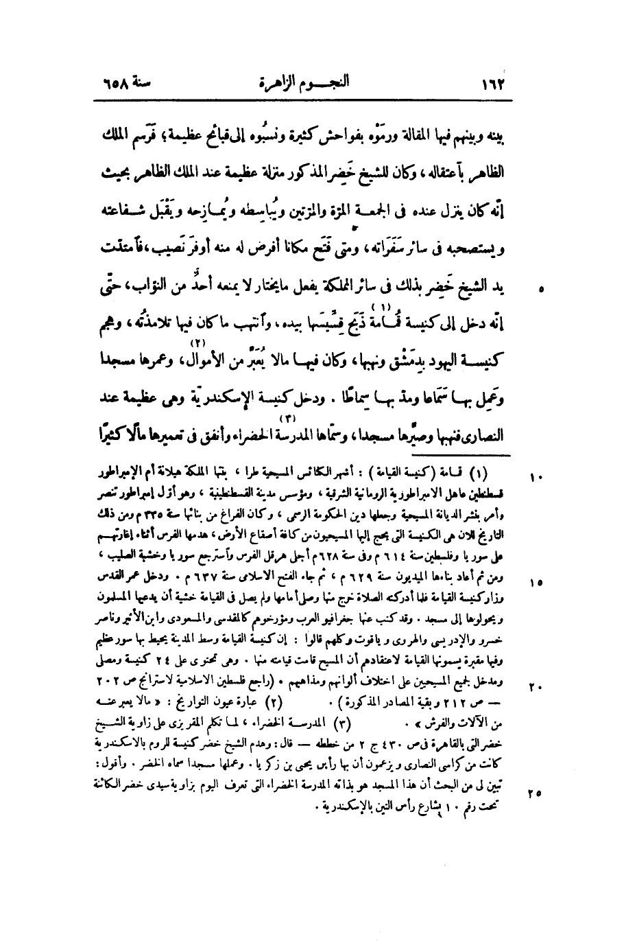 بينه وبينهم فيها المقالة ورموه بفواحش كثيرة ونسبوه إلى قبائح عظيمة؛ فرسم الملك الظاهر باعتقاله، وكان للشيخ خضر المذكور منزلة عظيمة عند الملك الظاهر بحيث إنّه كان ينزل عنده فى الجمعة المرّة والمرّتين ويباسطه ويمازحه ويقبل شفاعته ويستصحبه فى سائر سفراته، ومتى فتح مكانا أفرض له منه أوفر نصيب، فامتدّت يد الشيخ خضر بذلك فى سائر المملكة يفعل ما يختار لا يمنعه أحد من النوّاب، حتّى إنّه دخل إلى كنيسة قمامة «1» ذبح قسّيسها بيده، وانتهب ما كان فيها تلامذته، وهجم كنيسة اليهود بدمشق ونهبها، وكان فيها ما لا يعبّر من الأموال «2» ، وعمرها مسجدا وعمل بها سماعا ومدّ بها سماطا. ودخل كنيسة الإسكندريّة وهى عظيمة عند النصارى فنهبها وصيّرها مسجدا، وسمّاها المدرسة «3» الخضراء وأنفق فى تعميرها مالا كثيرا