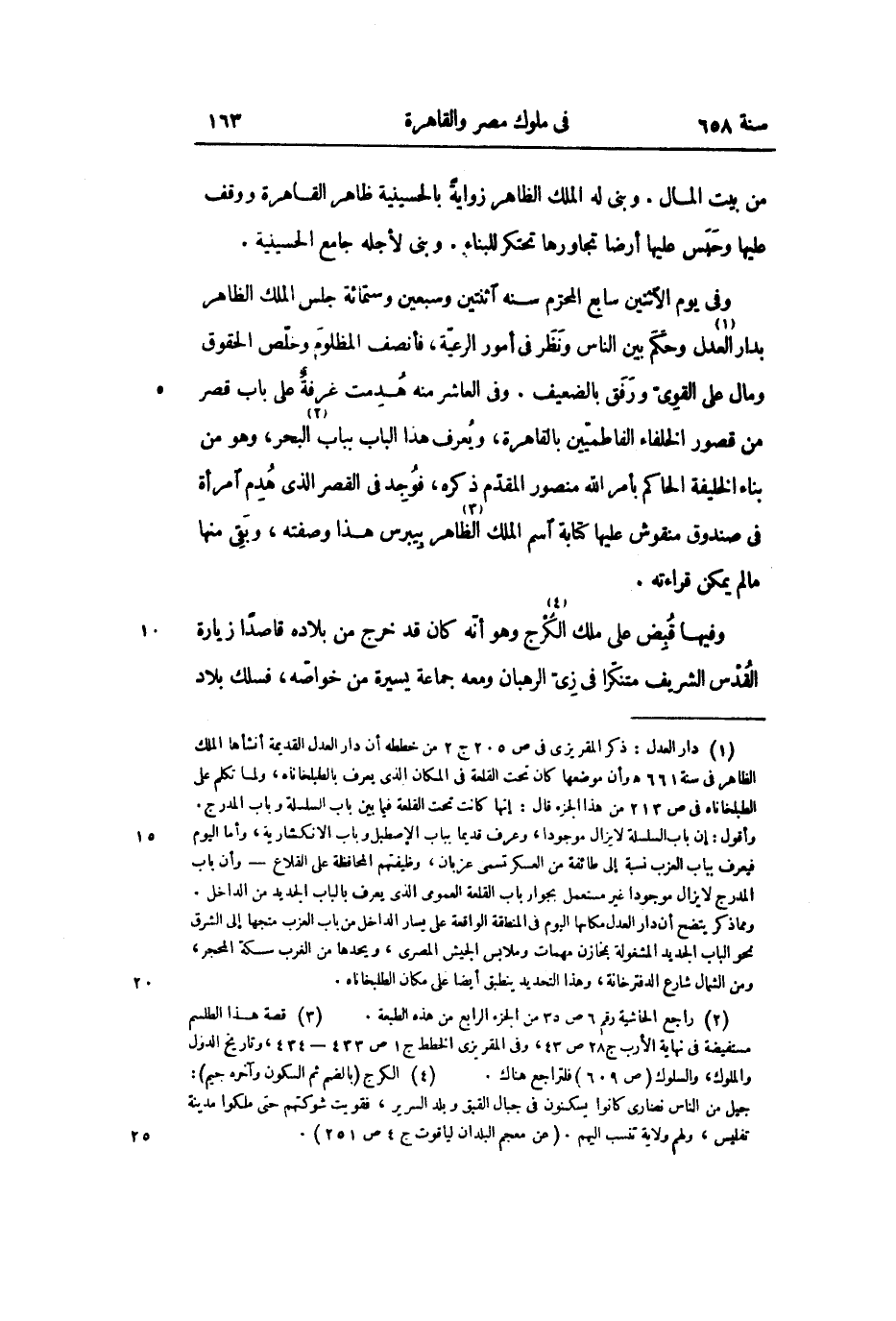 وفى يوم الاثنين سابع المحرّم سنة اثنتين وسبعين وستمائة جلس الملك الظاهر بدار «1» العدل وحكّم بين الناس ونظر فى أمور الرعيّة، فأنصف المظلوم وخلّص الحقوق ومال على القوىّ ورفق بالضعيف. وفى العاشر منه هدمت غرفة على باب قصر من قصور الخلفاء الفاطميّين بالقاهرة، ويعرف هذا الباب بباب «2» البحر، وهو من بناء الخليفة الحاكم بأمر الله منصور المقدّم ذكره، فوجد فى القصر الذي هدم امرأة فى صندوق منقوش عليها كتابة اسم الملك الظاهر «3» بيبرس هذا وصفته، وبقى منها ما لم يمكن قراءته.