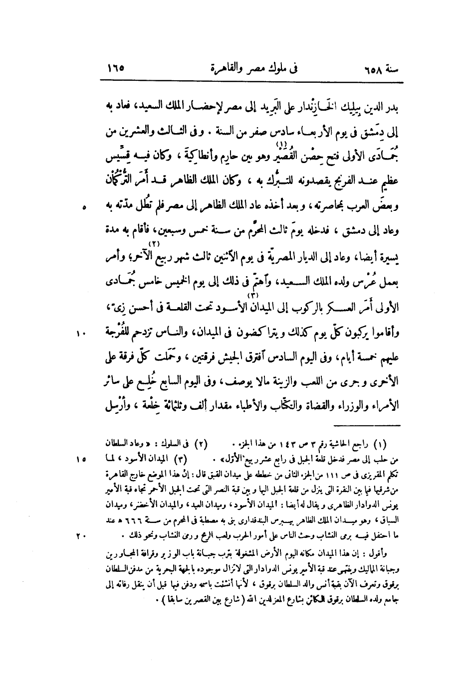 بدر الدين بيليك الخازندار على البريد إلى مصر لإحضار الملك السعيد، فعاد به إلى دمشق فى يوم الأربعاء سادس صفر من السنة. وفى الثالث والعشرين من جمادى الأولى فتح حصن القصير «1» وهو بين حارم وأنطاكية، وكان فيه قسّيس عظيم عند الفرنج يقصدونه للتبرّك به، وكان الملك الظاهر قد أمر التّركمان وبعض العرب بمحاصرته، وبعد أخذه عاد الملك الظاهر إلى مصر فلم تطل مدّته به وعاد إلى دمشق، فدخله يوم ثالث المحرّم من سنة خمس وسبعين، فأقام به مدة يسيرة أيضا، وعاد إلى الديار المصريّة فى يوم الاثنين ثالث شهر ربيع «2» الآخر؛ وأمر بعمل عرس ولده الملك السعيد، واهتمّ فى ذلك إلى يوم الخميس خامس جمادى الأولى أمر العسكر بالركوب إلى الميدان «3» الأسود تحت القلعة فى أحسن زىّ، وأقاموا يركبون كلّ يوم كذلك ويتراكضون فى الميدان، والناس تزدحم للفرجة عليهم خمسة أيام، وفى اليوم السادس افترق الجيش فرقتين، وحملت كلّ فرقة على الأخرى وجرى من اللعب والزينة ما لا يوصف، وفى اليوم السابع خلع على سائر الأمراء والوزراء والقضاة والكتّاب والأطباء مقدار ألف وثلثمائة خلعة، وأرسل