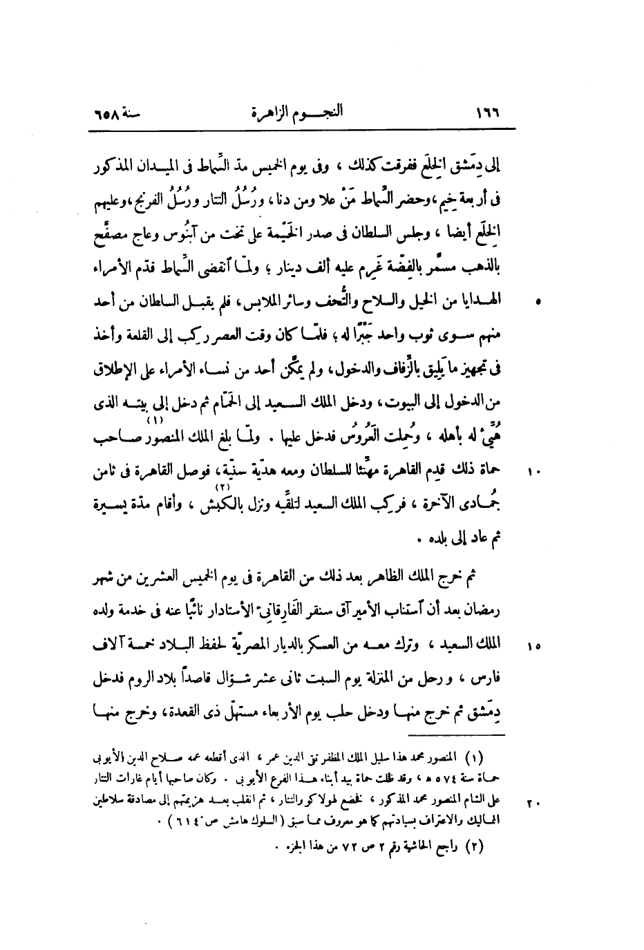 إلى دمشق الخلع ففرقت كذلك، وفى يوم الخميس مدّ السّماط فى الميدان المذكور فى أربعة خيم، وحضر السّماط من علا ومن دنا، ورسل التتار ورسل الفرنج، وعليهم الخلع أيضا، وجلس السلطان فى صدر الخيمة على تخت من آبنوس وعاج مصفّح بالذهب مسمّر بالفضّة غرم عليه ألف دينار؛ ولمّا انقضى السّماط قدّم الأمراء الهدايا من الخيل والسلاح والتّحف وسائر الملابس، فلم يقبل السلطان من أحد منهم سوى ثوب واحد جبرا له؛ فلمّا كان وقت العصر ركب إلى القلعة وأخذ فى تجهيز ما يليق بالزّفاف والدخول، ولم يمكّن أحد من نساء الأمراء على الإطلاق من الدخول إلى البيوت، ودخل الملك السعيد إلى الحمّام ثم دخل إلى بيته الذي هيّى له بأهله، وحملت العروس فدخل عليها. ولمّا بلغ الملك المنصور «1» صاحب حماة ذلك قدم القاهرة مهنّئا للسلطان ومعه هديّة سنيّة، فوصل القاهرة فى ثامن جمادى الآخرة، فركب الملك السعيد لتلقّيه ونزل بالكبش «2» ، وأقام مدّة يسيرة ثم عاد إلى بلده.