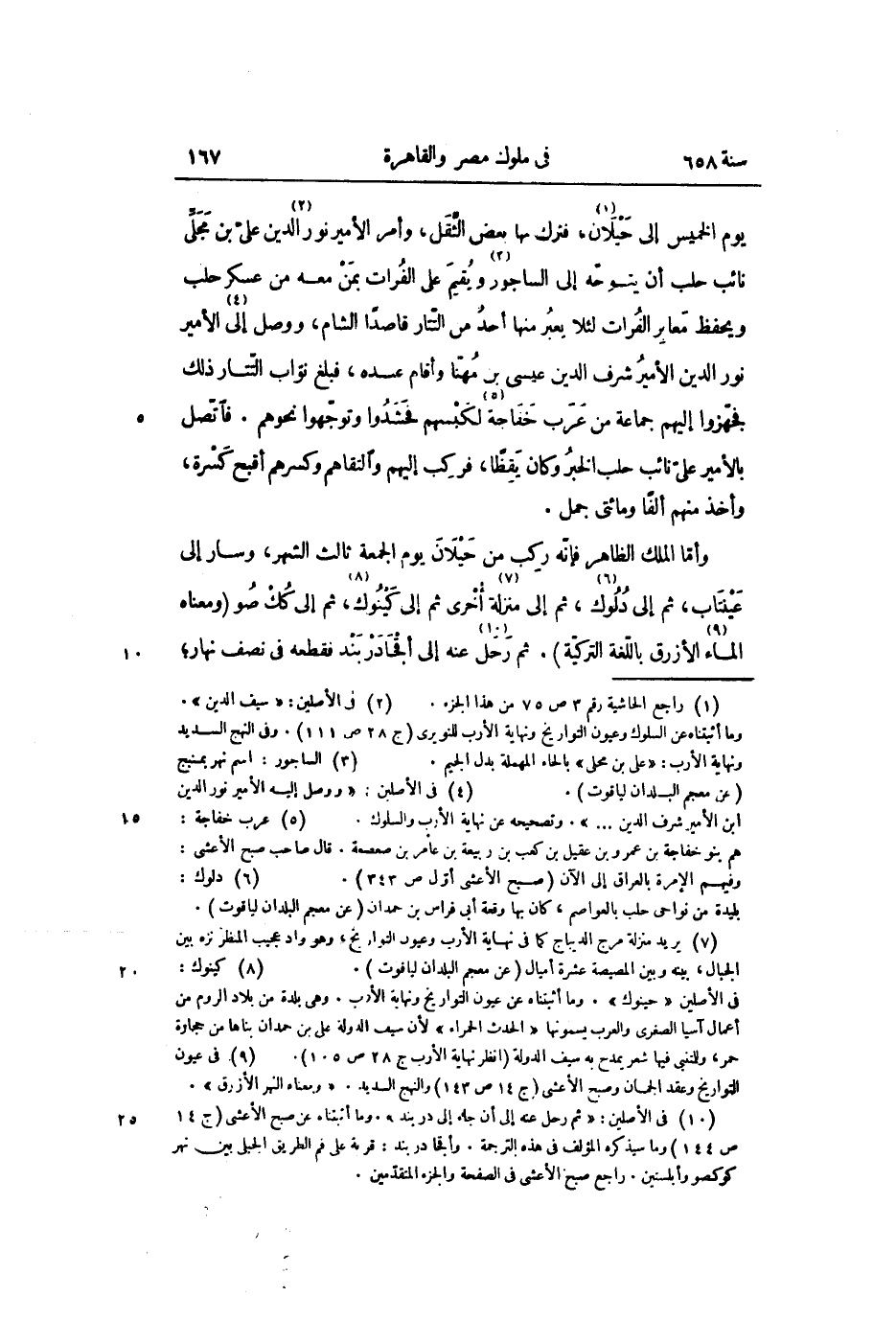 يوم الخميس إلى حيلان «1» ، فترك بها بعض الثّقل، وأمر الأمير نور الدين «2» علىّ بن جبل مجلىّ نائب حلب أن يتوجّه إلى الساجور «3» ويقيم على الفرات بمن معه من عسكر حلب ويحفظ معابر الفرات لئلا يعبر منها أحد من التّتار قاصدا الشام، ووصل إلى «4» الأمير نور الدين الأمير شرف الدين عيسى بن مهنّا وأقام عنده، فبلغ نوّاب التّتار ذلك فجهّزوا إليهم جماعة من عرب خفاجة «5» لكبسهم فحشدوا وتوجّهوا نحوهم. فاتّصل بالأمير علىّ نائب حلب الخبر وكان يقظا، فركب إليهم والتقاهم وكسرهم أقبح كسرة، وأخذ منهم ألفا ومائتى جمل.