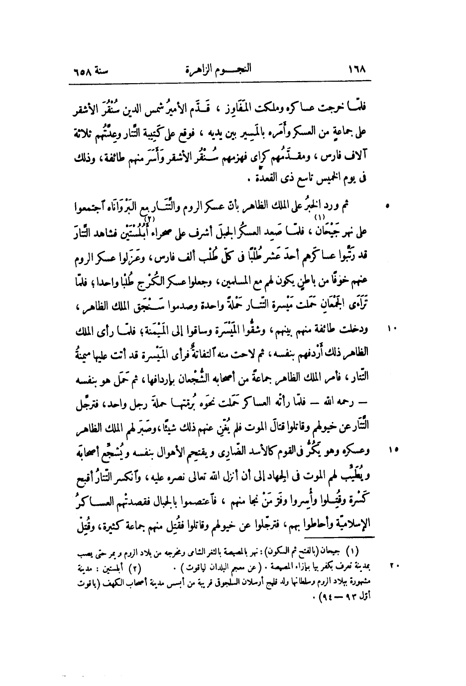 ثم ورد الخبر على الملك الظاهر بأنّ عسكر الروم والتّتار مع البرواناه اجتمعوا على نهر جيحان «1» ، فلمّا صعد العسكر الجبل أشرف على صحراء «2» أبلستين فشاهد التّتار قد رتّبوا عساكرهم أحد عشر طلبا فى كلّ طلب ألف فارس، وعزلوا عسكر الروم عنهم خوفا من باطن يكون لهم مع المسلمين، وجعلوا عسكر الكرج طلبا واحدا؛ فلمّا تراءى الجمعان حملت ميسرة التّتار حملة واحدة وصدموا سنجق الملك الظاهر، ودخلت طائفة منهم بينهم، وشقّوا الميسرة وساقوا إلى الميمنة؛ فلمّا رأى الملك الظاهر ذلك أردفهم بنفسه، ثم لاحت منه التفاتة فرأى الميسرة قد أتت عليها ميمنة التّتار، فأمر الملك الظاهر جماعة من أصحابه الشّجعان بإردافها، ثم حمل هو بنفسه- رحمه الله- فلمّا رأته العساكر حملت نحوه برمّتها حملة رجل واحد، فترجّل التّتار عن خيولهم وقاتلوا قتال الموت فلم يغن عنهم ذلك شيئا، وصبر لهم الملك الظاهر وعسكره وهو يكرّ فى القوم كالأسد الضّارى ويقتحم الأهوال بنفسه ويشجّع أصحابه ويطيّب لهم الموت فى الجهاد إلى أن أنزل الله تعالى نصره عليه، وانكسر التّتار أقبح كسرة وقتلوا وأسروا وفرّ من نجا منهم، فاعتصموا بالجبال فقصدتهم العساكر الإسلاميّة وأحاطوا بهم، فترجّلوا عن خيولهم وقاتلوا فقتل منهم جماعة كثيرة، وقتل