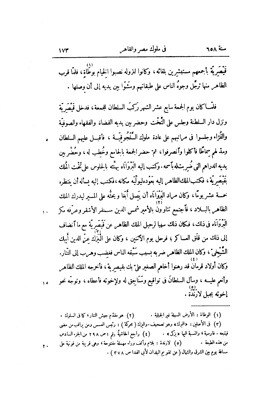 فلمّا كان يوم الجمعة سابع عشر الشهر ركب السلطان للجمعة، فدخل قيصريّة ونزل دار السلطنة وجلس على التّخت وحضر بين يديه القضاة والفقهاء والصوفيّة والقرّاء وجلسوا فى مراتبهم على عادة ملوك السّلجوقيّة، فأقبل عليهم السلطان ومدّ لهم سماطا فأكلوا وانصرفوا، ثمّ حضر الجمعة بالجامع وخطب له، وحضّر بين يديه الدراهم التى ضربت له باسمه. وكتب إليه البرواناه يهنّئه بالجلوس على تخت الملك بقيصريّة، فكتب الملك الظاهر إليه بعوده ليولّيه مكانه، فكتب إليه يسأله أن ينتظره خمسة عشر يوما، وكان مراد البرواناه أن يصل أبغا ويحثّه على المسير ليدرك الملك الظاهر بالبلاد، فاجتمع تتاوون «2» بالأمير شمس الدين سنقر الأشقر وعرّفه مكر البرواناه فى ذلك، فكان ذلك سببا لرحيل الملك الظاهر عن قيصريّة مع ما انضاف إلى ذلك من قلق العساكر؛ فرحل يوم الاثنين، وكان على اليزك «3» عزّ الدين أيبك الشّيخىّ، وكان الملك الظاهر ضربه بسبب سبقه الناس فغضب وهرب إلى التّتار.