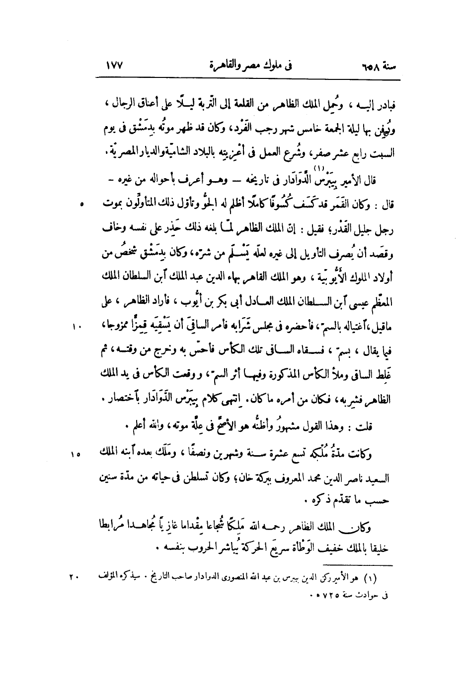 قال الأمير بيبرس «1» الدّوادار فى تاريخه- وهو أعرف بأحواله من غيره- قال: وكان القمر قد كسف كسوفا كاملا أظلم له الجوّ وتأوّل ذلك المتأولّون بموت رجل جليل القدر؛ فقيل: إنّ الملك الظاهر لمّا بلغه ذلك حذر على نفسه وخاف وقصد أن يصرف التأويل إلى غيره لعلّه يسلم من شرّه، وكان بدمشق شخص من أولاد الملوك الأيّوبيّة، وهو الملك القاهر بهاء الدين عبد الملك ابن السلطان الملك المعظّم عيسى ابن السلطان الملك العادل أبى بكر بن أيّوب، فأراد الظاهر، على ما قيل، اغتياله بالسمّ، فأحضره فى مجلس شرابه فأمر الساقى أن يسقيه قمزّا ممزوجا، فيما يقال، بسمّ، فسقاه الساقى تلك الكأس فأحسّ به وخرج من وقته، ثم غلط الساقى وملأ الكأس المذكورة وفيها أثر السمّ، ووقعت الكأس فى يد الملك الظاهر فشربه، فكان من أمره ما كان. انتهى كلام بيبرس الدّوادار باختصار.