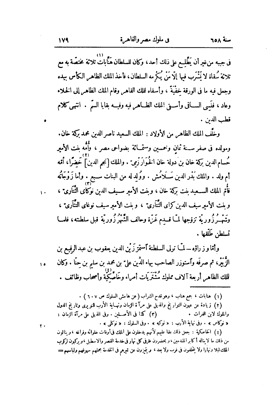 فى جيبه من غير أن يطّلع على ذلك أحد، وكان للسلطان هنّا بات «1» ثلاثة مختصّة به مع ثلاثة سقاة لا يشرب فيها إلّا من يكرمه السلطان، فأخذ الملك الظاهر الكأس بيده وجعل فيه ما فى الورقة خفية، وأسقاه للملك القاهر وقام الملك الظاهر إلى الخلاء وعاد، فنسى الساقى وأسقى الملك الظاهر فيه وفيه بقايا السمّ. انتهى كلام قطب الدين.
