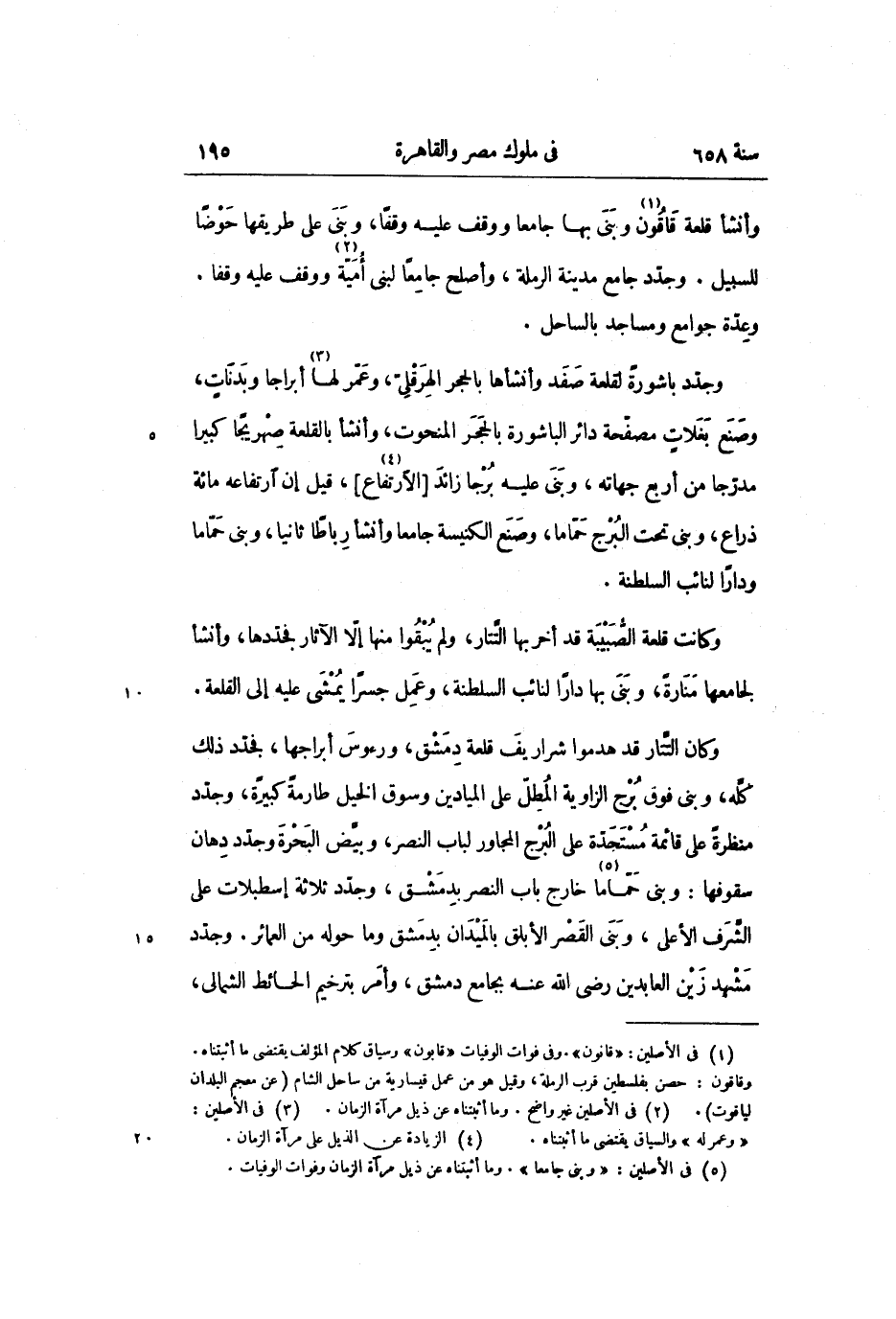 وكان التّتار قد هدموا شراريف قلعة دمشق، ورءوس أبراجها، فجدّد ذلك كلّه، وبنى فوق برج الزاوية المطلّ على الميادين وسوق الخيل طارمة كبيرة، وجدّد منظرة على قائمة مستجدّة على البرج المجاور لباب النصر، وبيّض البحرة وجدّد دهان سقوفها: وبنى حمّاما «5» خارج باب النصر بدمشق، وجدّد ثلاثة إسطبلات على الشّرف الأعلى، وبنى القصر الأبلق بالميدان بدمشق وما حوله من العمائر. وجدّد مشهد زين العابدين رضى الله عنه بجامع دمشق، وأمر بترخيم الحائط الشمالى،