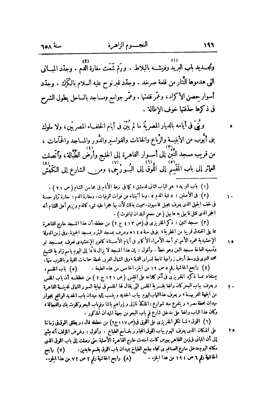 وبنى فى أيامه بالديار المصريّة ما لم يبن فى أيام الخلفاء المصريّين، ولا ملوك بنى أيّوب من الأبنية والرّباع والخانات والقواسير والدّور والمساجد والحمّمات، من قريب مسجد التّبن «3» إلى أسوار القاهرة إلى الخليج وأرض «4» الطّبّالة، واتّصلت العمائر إلى باب المقسم «5» إلى اللّوق «6» إلى البورجى «7» ؛ ومن الشارع إلى الكبش «8»