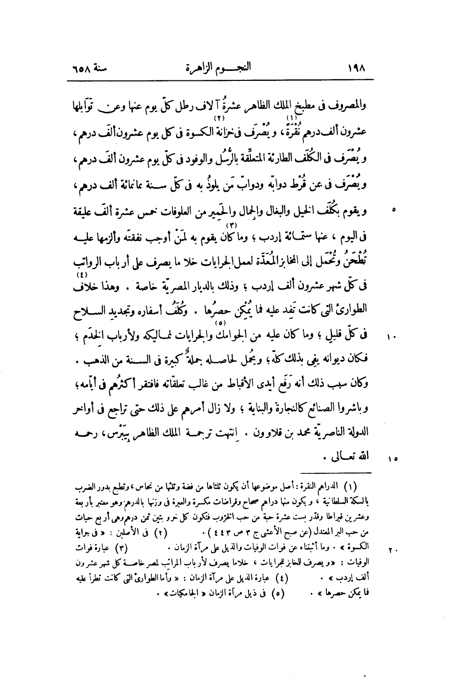 والمصروف فى مطبخ الملك الظاهر عشرة آلاف رطل كلّ يوم عنها وعن توابلها عشرون ألف درهم نقرة «1» ، ويصرف فى خزانة «2» الكسوة فى كل يوم عشرون ألف درهم، ويصرف فى الكلف الطارئة المتعلّقة بالرّسل والوفود فى كلّ يوم عشرون ألف درهم، ويصرف عن قرط دوابّه ودوابّ من يلوذ به فى كلّ سنة ثمانمائة ألف درهم، ويقوم بكلف الخيل والبغال والجمال والحمير من العلوفات خمس عشرة ألف عليقة فى اليوم، عنها ستمائة إردب؛ وما كان «3» يقوم به لمن أوجب نفقته وألزمها عليه تطحن وتحمل إلى المخابز المعدّة لعمل الجرايات خلا ما يصرف على أرباب الرواتب فى كلّ شهر عشرون ألف إردب؛ وذلك بالديار المصريّة خاصة. وهذا خلاف «4» الطوارئ التى كانت تفد عليه فما يمكن حصرها. وكلف أسفاره وتجديد السلاح فى كلّ قليل؛ وما كان عليه من الجوامك «5» والجرايات لمماليكه ولأرباب الخدم؛ فكان ديوانه يفى بذلك كلّه؛ ويحمل لحاصله جملة كبيرة فى السنة من الذهب.
