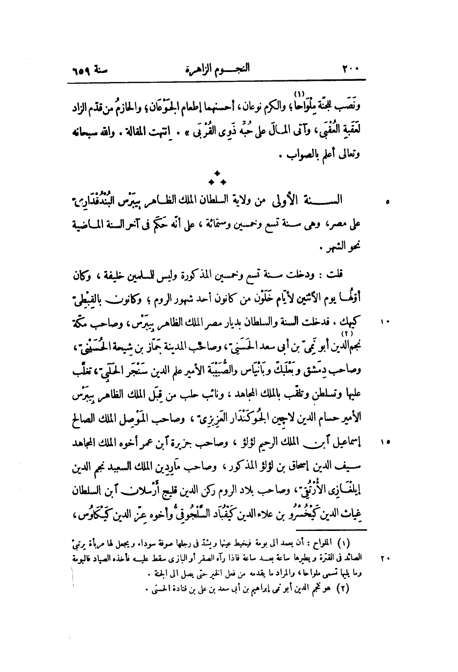 قلت: ودخلت سنة تسع وخمسين المذكورة وليس للمسلمين خليفة، وكان أوّلها يوم الاثنين لأيّام خلون من كانون أحد شهور الروم؛ وكانون بالقبطىّ كيهك. فدخلت السنة والسلطان بديار مصر الملك الظاهر بيبرس، وصاحب مكّة نجم الدين «2» أبو نمىّ بن أبى سعد الحسنىّ، وصاحب المدينة جمّاز بن شيحة الحسينىّ، وصاحب دمشق وبعلبكّ وبانياس والصّبيبة الأمير علم الدين سنجر الحلبىّ، تغلّب عليها وتسلطن وتلقّب بالملك المجاهد، ونائب حلب من قبل الملك الظاهر بيبرس الأمير حسام الدين لاچين الجوكندار العزيزىّ، وصاحب الموصل الملك الصالح إسماعيل ابن الملك الرحيم لؤلؤ، وصاحب جزيرة ابن عمر أخوه الملك المجاهد سيف الدين إسحاق بن لؤلؤ المذكور، وصاحب ماردين الملك السعيد نجم الدين إيلغازى الأرتقىّ، وصاحب بلاد الروم ركن الدين قليج أرسلان ابن السلطان غياث الدين كيخسرو بن علاء الدين كيقباد السّلجوقىّ وأخوه عزّ الدين كيكاوس،