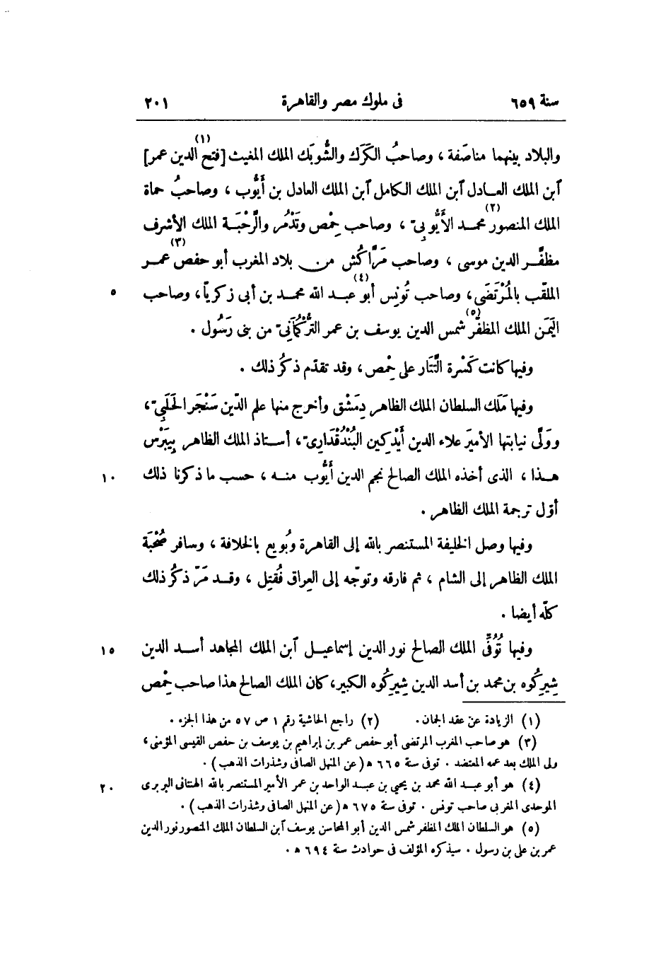 وفيها وصل الخليفة المستنصر بالله إلى القاهرة وبويع بالخلافة، وسافر صحبة الملك الظاهر إلى الشام، ثم فارقه وتوجّه إلى العراق فقتل، وقد مرّ ذكر ذلك كلّه أيضا.