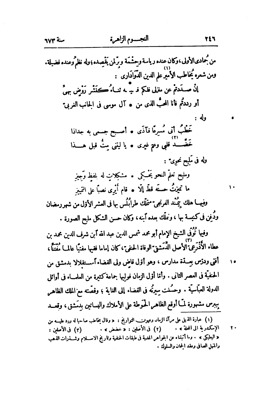 وفيها توفّى الشيخ الإمام أبو محمد شمس الدين عبد الله ابن شرف الدين محمد بن عطاء الأذرعىّ «3» الأصل الدّمشقىّ الوفاة الحنفىّ، كان إماما فقيها مفتيا عالما مفتّنا، أفتى ودرّس بعدّة مدارس، وهو أوّل قاض ولى القضاء استقلالا بدمشق من الحنفيّة فى العصر الثانى. وأمّا أوّل الزمان فوليها جماعة كثيرة من العلماء فى أوائل الدولة العبّاسيّة. وحسنت سيرته فى القضاء إلى الغاية؛ وقصّته مع الملك الظاهر بيبرس مشهورة لمّا أوقع الظاهر الحوطة على الأملاك والبساتين بدمشق، وقعد