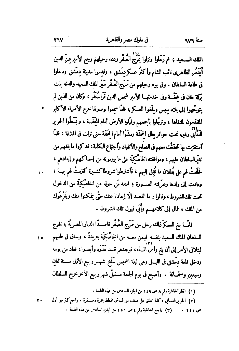الملك السعيد؛ ثم رحلوا ونزلوا بمرج «1» الصّفّر وعند رحيلهم رجع الأمير عزّ الدين أيدمر الظاهرى نائب الشام وأكثر عسكر دمشق، وقدموا مدينة دمشق ودخلوا فى طاعة السلطان. وفى يوم رحيلهم من مرج الصّفّر سيّر الملك السعيد والدته بنت بركة خان فى محفّة وفى خدمتها الأمير شمس الدين قرا سنقر، وكان من الذين لم يتوجّهوا إلى بلاد سيس ولحقوا العسكر؛ فلمّا سمعوا بوصولها خرج الأمراء الأكابر المقدّمون لملتقاها، وترجّلوا بأجمعهم وقبّلوا الأرض أمام المحفّة، وبسطوا الحرير العتّابى «2» وغيره تحت حوافر بغال المحفّة ومشوا أمام المحفّة حتى نزلت فى المنزلة، فلمّا استقرّت بها تحدّثت معهم فى الصلح والانقياد واجتماع الكلمة، فذكروا ما بلغهم من تغيّر السلطان عليهم، وموافقته الخاصّكيّة على ما يرومونه من إمساكهم وإبعادهم؛ فحلفت لهم على بطلان ما نقل إليهم، فاشترطوا شروطا كثيرة التزمت لهم بها، وعادت إلى ولدها وعرّفته الصورة؛ فمنعه من حوله من الخاصّكيّة من الدخول تحت تلك الشروط، وقالوا: ما القصد إلّا إبعادنا عنك حتّى يتمكنوا منك وينزعوك من الملك، فمال إلى كلامهم وأبى قبول تلك الشروط.