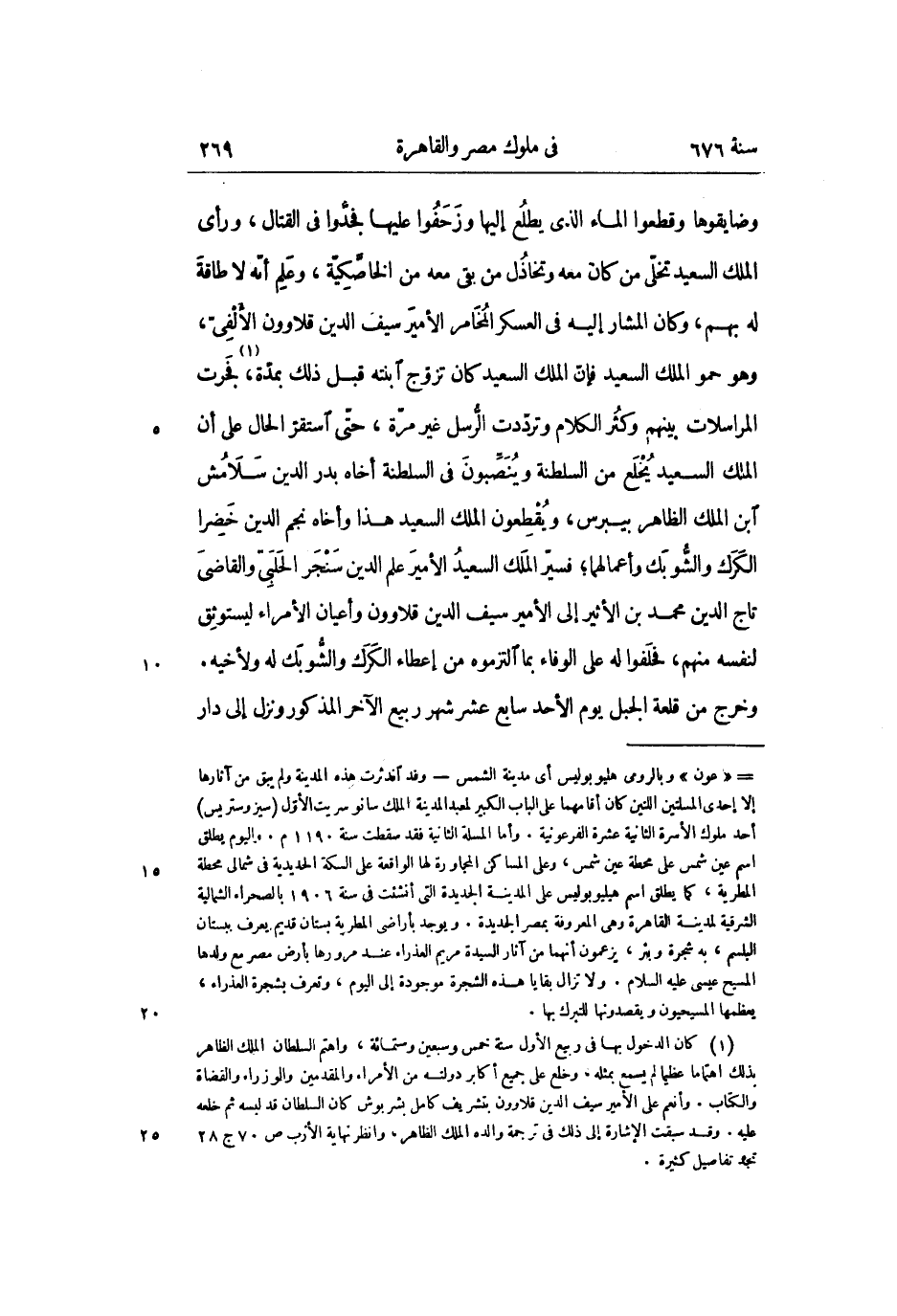 وضايقوها وقطعوا الماء الذي يطلع إليها وزحفوا عليها فجدّوا فى القتال، ورأى الملك السعيد تخلّى من كان معه وتخاذل من بقى معه من الخاصّكيّة، وعلم أنّه لا طاقة له بهم، وكان المشار إليه فى العسكر المخامر الأمير سيف الدين قلاوون الألفىّ، وهو حمو الملك السعيد فإنّ الملك السعيد كان تزوّج ابنته قبل ذلك بمدّة «1» ، فجرت المراسلات بينهم وكثر الكلام وتردّدت الرّسل غير مرّة، حتّى استقرّ الحال على أن الملك السعيد يخلع من السلطنة وينصّبون فى السلطنة أخاه بدر الدين سلامش ابن الملك الظاهر بيبرس، ويقطعون الملك السعيد هذا وأخاه نجم الدين خضرا الكرك والشّوبك وأعمالهما؛ فسيّر الملك السعيد الأمير علم الدين سنجر الحلبىّ والقاضى تاج الدين محمد بن الأثير إلى الأمير سيف الدين قلاوون وأعيان الأمراء ليستوثق لنفسه منهم، فحلفوا له على الوفاء بما التزموه من إعطاء الكرك والشّوبك له ولأخيه.
