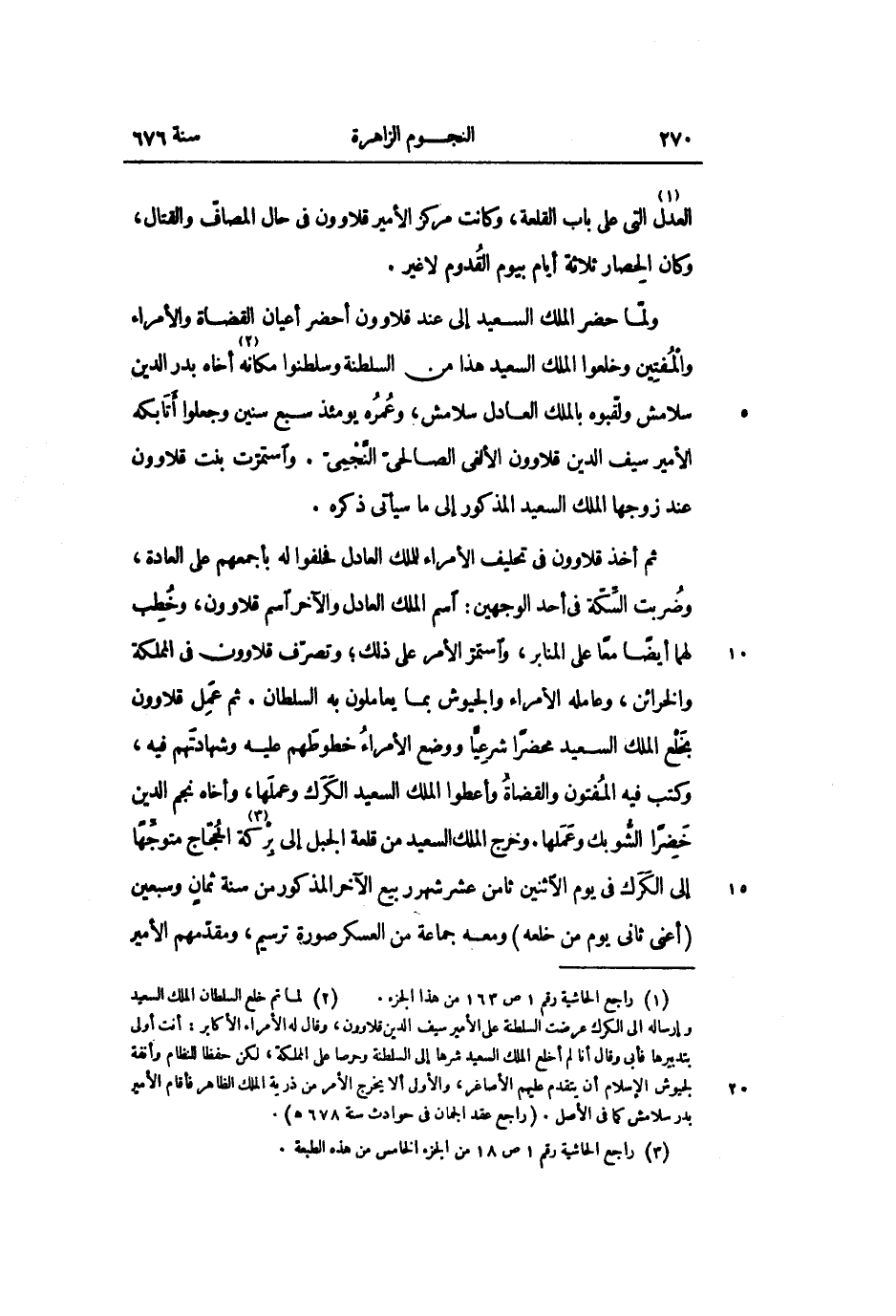 ثم أخذ قلاوون فى تحليف الأمراء للملك العادل فحلفوا له بأجمعهم على العادة، وضربت السّكّة فى أحد الوجهين: اسم الملك العادل والآخر اسم قلاوون، وخطب لهما أيضا معا على المنابر، واستمرّ الأمر على ذلك؛ وتصرّف قلاوون فى المملكة والخزائن، وعامله الأمراء والجيوش بما يعاملون به السلطان. ثم عمل قلاوون بخلع الملك السعيد محضرا شرعيّا ووضع الأمراء خطوطهم عليه وشهادتهم فيه، وكتب فيه المفتون والقضاة وأعطوا الملك السعيد الكرك وعملها، وأخاه نجم الدين خضرا الشّوبك وعملها. وخرج الملك السعيد من قلعة الجبل إلى بركة «3» الحجّاج متوجّها إلى الكرك فى يوم الاثنين ثامن عشر شهر ربيع الآخر المذكور من سنة ثمان وسبعين (أعنى ثانى يوم من خلعه) ومعه جماعة من العسكر صورة ترسيم، ومقدّمهم الأمير