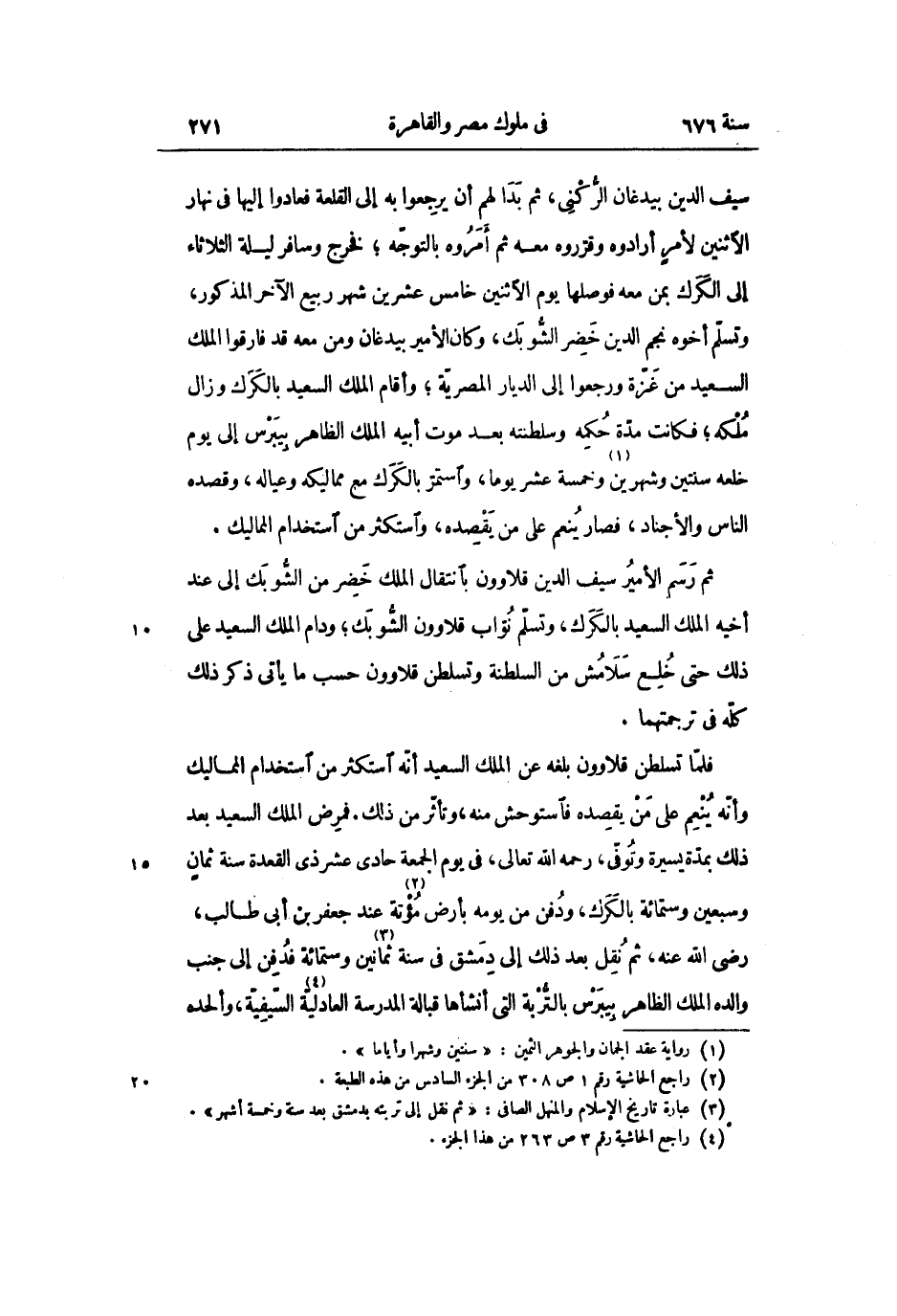 فلمّا تسلطن قلاوون بلغه عن الملك السعيد أنّه استكثر من استخدام المماليك وأنّه ينعم على من يقصده فاستوحش منه، وتأثّر من ذلك. فمرض الملك السعيد بعد ذلك بمدّة يسيرة وتوفّى، رحمه الله تعالى، فى يوم الجمعة حادى عشر ذى القعدة سنة ثمان وسبعين وستمائة بالكرك، ودفن من يومه بأرض «2» مؤتة عند جعفر بن أبى طالب، رضى الله عنه، ثم نقل بعد ذلك إلى دمشق فى سنة «3» ثمانين وستمائة فدفن إلى جنب والده الملك الظاهر بيبرس بالتّربة التى أنشأها قبالة المدرسة العادليّة «4» السّيفيّة، وألحده