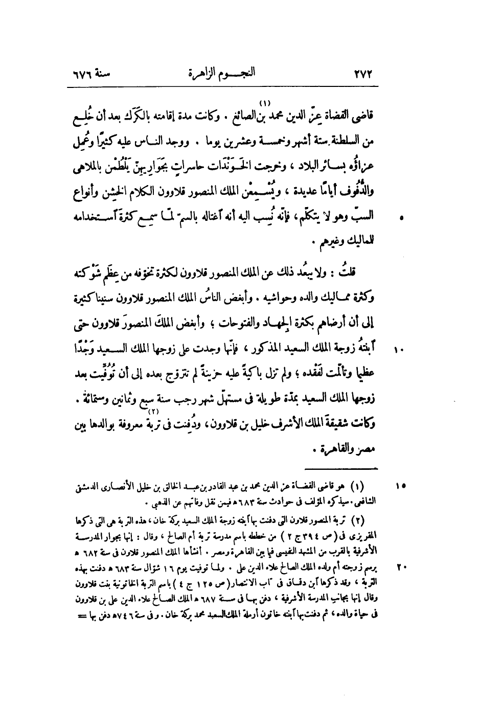 قلت: ولا يبعد ذلك عن الملك المنصور قلاوون لكثرة تخوّفه من عظم شوكته وكثرة مماليك والده وحواشيه. وأبغض الناس الملك المنصور قلاوون سنينا كثيرة إلى أن أرضاهم بكثرة الجهاد والفتوحات؛ وأبغض الملك المنصور قلاوون حتى ابنته زوجة الملك السعيد المذكور، فإنّها وجدت على زوجها الملك السعيد وجدا عظيما وتألّمت لفقده؛ ولم تزل باكية عليه حزينة لم تتزوّج بعده إلى أن توفّيت بعد زوجها الملك السعيد بمدّة طويلة فى مستهلّ شهر رجب سنة سبع وثمانين وستمائة.