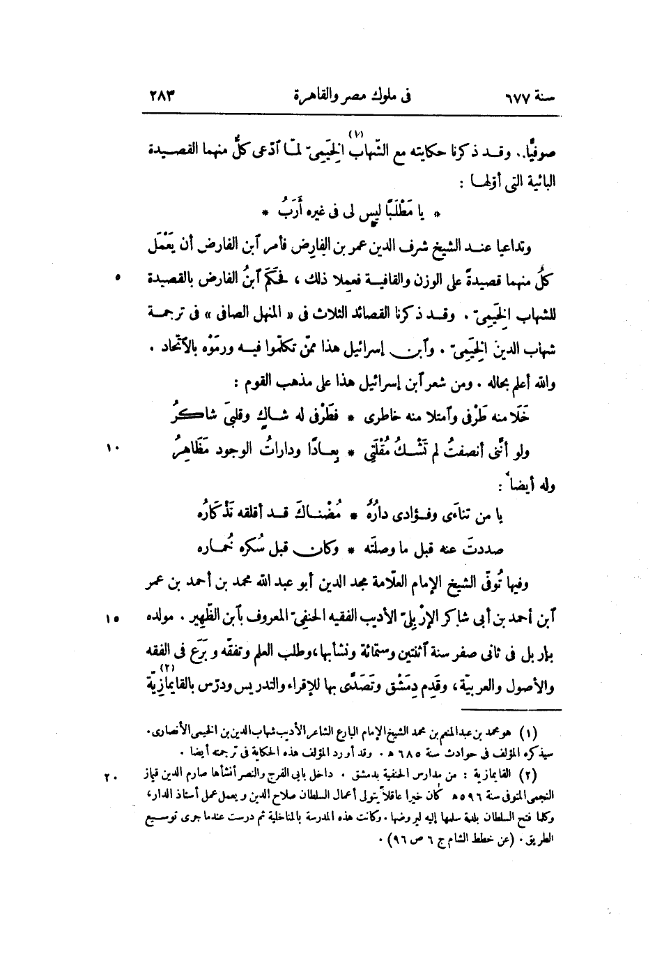 وتداعيا عند الشيخ شرف الدين عمر بن الفارض فأمر ابن الفارض أن يعمل كل منهما قصيدة على الوزن والقافية فعملا ذلك، فحكم ابن الفارض بالقصيدة للشهاب الخيمىّ. وقد ذكرنا القصائد الثلاث فى «المنهل الصافى» فى ترجمة شهاب الدين الخيمىّ. وابن إسرائيل هذا ممّن تكلّموا فيه ورموه بالاتّحاد.