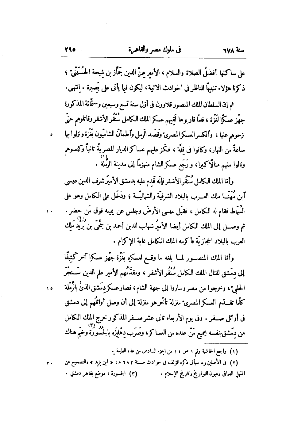 ثم إنّ السلطان الملك المنصور قلاوون فى أوّل سنة تسع وسبعين وستّمائة المذكورة جهّز عسكرا لغزّة، فلمّا قاربوها لقيهم عسكر الملك الكامل سنقر الأشقر وقاتلوهم حتّى نزحوهم عنها، وانكسر العسكر المصرىّ وقصد الرّمل واطمأنّ الشاميّون بغزّة ونزلوا بها ساعة من النهار، وكانوا فى قلّة، فكرّ عليهم عساكر الديار المصريّة ثانيا وكبسوهم ونالوا منهم منالا كبيرا، ورجع عسكر الشام منهزما إلى مدينة الرّملة «1» .