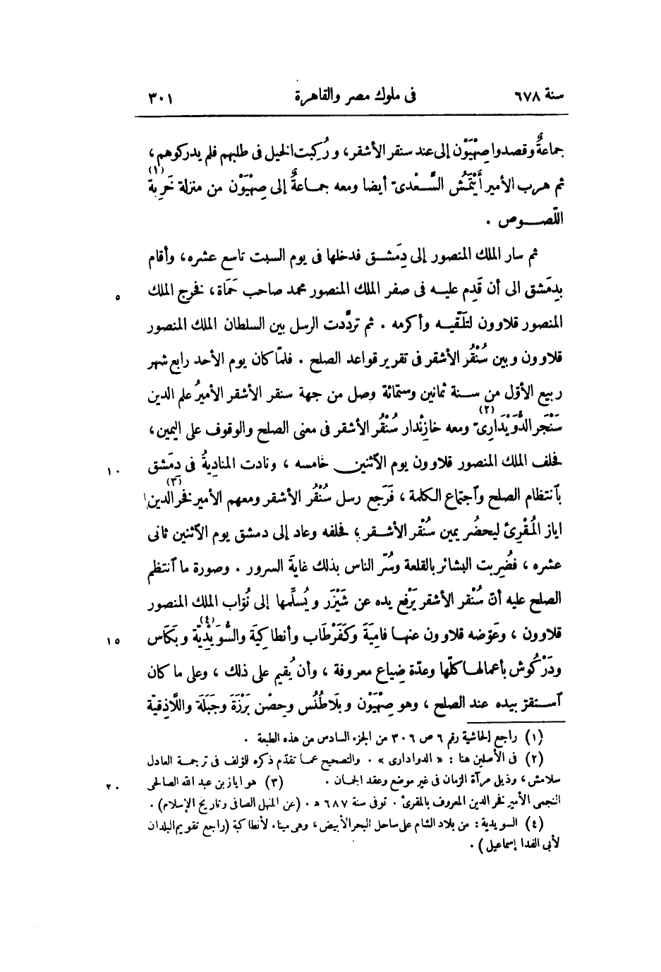 ثم سار الملك المنصور إلى دمشق فدخلها فى يوم السبت تاسع عشره، وأقام بدمشق الى أن قدم عليه فى صفر الملك المنصور محمد صاحب حماة، فخرج الملك المنصور قلاوون لتلقّيه وأكرمه. ثم تردّدت الرسل بين السلطان الملك المنصور قلاوون وبين سنقر الأشقر فى تقرير قواعد الصلح. فلمّا كان يوم الأحد رابع شهر ربيع الأوّل من سنة ثمانين وستمائة وصل من جهة سنقر الأشقر الأمير علم الدين سنجر الدّويدارىّ «2» ومعه خازندار سنقر الأشقر فى معنى الصلح والوقوف على اليمين، فحلف الملك المنصور قلاوون يوم الاثنين خامسه، ونادت المنادية فى دمشق بانتظام الصلح واجتماع الكلمة، فرجع رسل سنقر الأشقر ومعهم الأمير فخر «3» الدين اياز المقرئ ليحضر يمين سنقر الأشقر، فحلفه وعاد إلى دمشق يوم الاثنين ثانى عشره، فضربت البشائر بالقلعة وسرّ الناس بذلك غاية السرور. وصورة ما انتظم الصلح عليه أنّ سنقر الأشقر يرفع يده عن شيزر ويسلّمها إلى نوّاب الملك المنصور قلاوون، وعوّضه قلاوون عنها فامية وكفر طاب وأنطاكية والسّويديّة «4» وبكاس ودركوش بأعمالها كلّها وعدّة ضياع معروفة، وأن يقيم على ذلك، وعلى ما كان استقرّ بيده عند الصلح، وهو صهيون وبلاطنس وحصن برزة وجبلة واللّاذقيّة