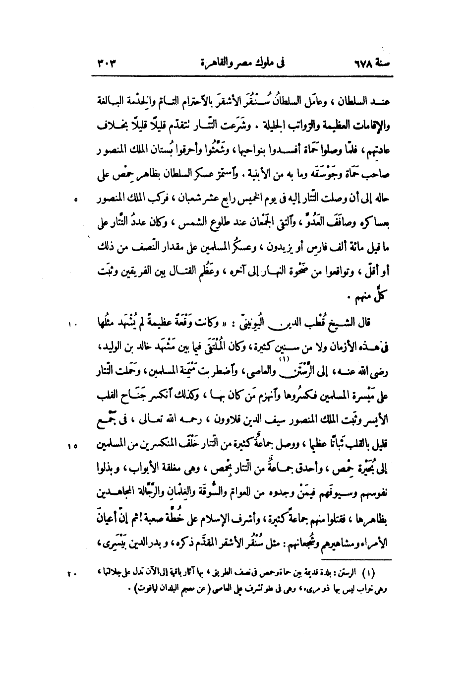 عند السلطان، وعامل السلطان سنقر الأشقر بالاحترام التامّ والخدمة البالغة والإقامات العظيمة والرّواتب الجليلة. وشرعت التّتار تتقدّم قليلا قليلا بخلاف عادتهم، فلمّا وصلوا حماة أفسدوا بنواحيها، وشعّثوا وأحرقوا بستان الملك المنصور صاحب حماة وجوسقه وما به من الأبنية. واستمرّ عسكر السلطان بظاهر حمص على حاله إلى أن وصلت التّتار إليه فى يوم الخميس رابع عشر شعبان، فركب الملك المنصور بعساكره وصافف العدوّ، والتقى الجمعان عند طلوع الشمس، وكان عدد التّتار على ما قيل مائة ألف فارس أو يزيدون، وعسكر المسلمين على مقدار النّصف من ذلك أو أقلّ، وتواقعوا من ضحوة النهار إلى آخره، وعظم القتال بين الفريقين وثبت كلّ منهم.