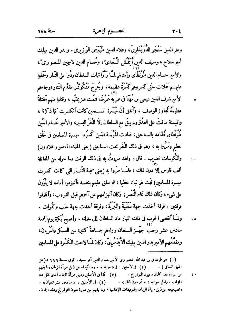 وعلم الدين سنجر الدّويدارىّ، وعلاء الدين طيبرس الوزيرى، وبدر الدين بيليك أمير سلاح، وسيف الدين أيتمش السّعدىّ، وحسام الدين لاچين المنصورىّ، والأمير حسام الدين طرنطاى «1» وأمثالهم لمّا رأوا ثبات السلطان ردّوا على التّتار وحملوا عليهم حملات حتّى كسروهم كسرة عظيمة، وجرح منكوتمر مقدّم التّتار، وجاءهم الأمير شرف الدين عيسى بن مهنّا فى عربه «2» عرضا فتّمت هزيمتهم، وقتلوا منهم مقتلة عظيمة تجاوز الوصف، واتّفق أنّ ميسرة المسلمين كانت انكسرت كما ذكرنا، والميمنة ساقت على العدوّ ولم يبق مع السلطان إلّا النّفر اليسير، والأمير حسام الدّين طرنطاى قدّامه بالسناجق، فعادت الميمنة الذين كسروا ميسرة المسلمين فى خلق عظيم ومرّوا به، وهو فى ذلك النّفر تحت السناجق (يعنى الملك المنصور قلاوون) والكوسات تضرب. قال: ولقد مررت به فى ذلك الوقت وما حوله من المقاتلة ألف فارس إلا «3» دون ذلك، فلمّا مرّوا به (يعنى ميمنة التّتار التى كانت كسرت ميسرة المسلمين) ثبت لهم ثباتا عظيما، ثم ساق عليهم بنفسه فانهزموا أمامه لا يلوون على شىء، وكان ذلك تمام النّصر؛ وكان انهزامهم عن آخرهم قبل الغروب، وافترقوا فرقتين: فرقة أخذت جهة سلمية والبرّيّة، وفرقة أخذت جهة حلب والفرات.