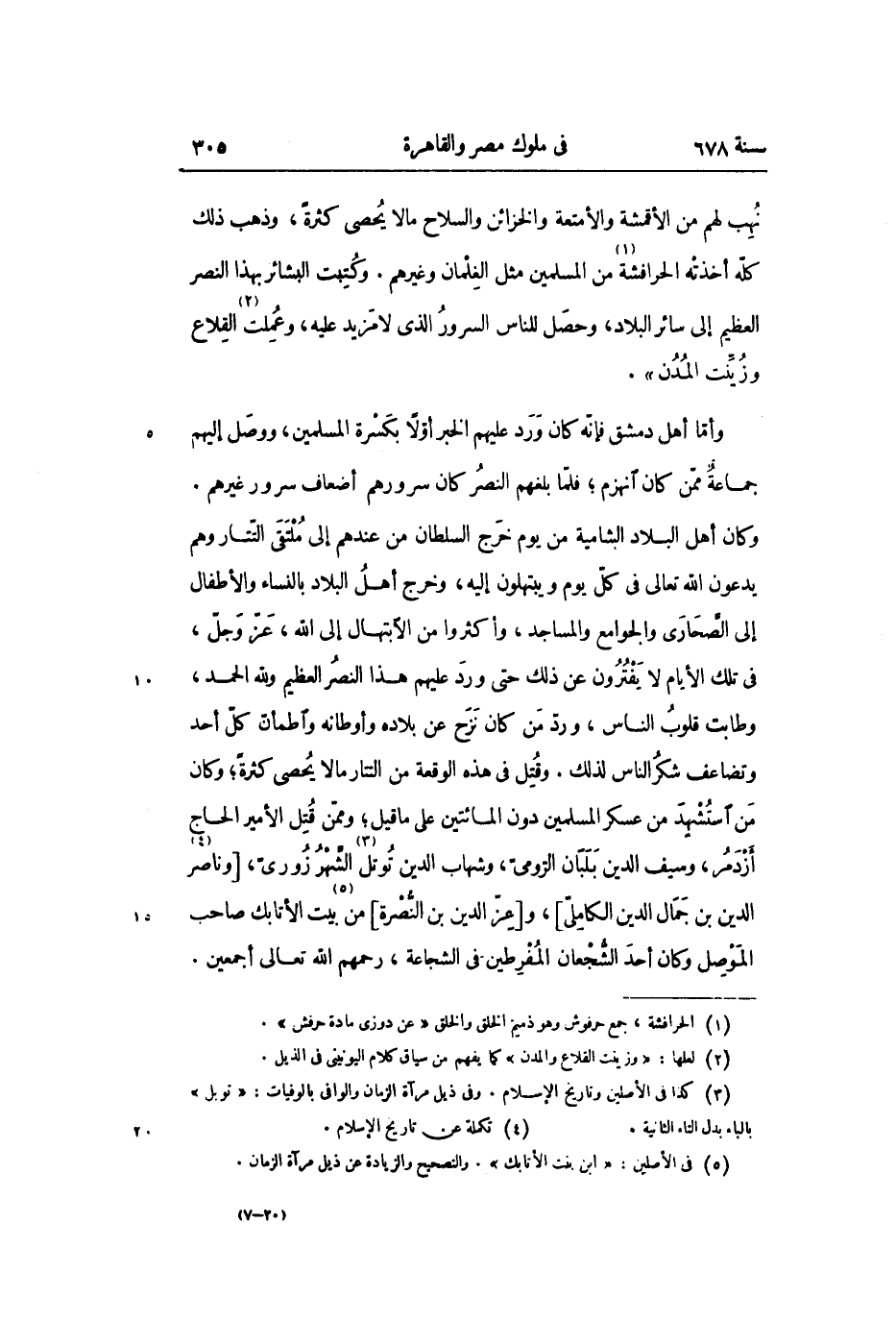 وكان أهل البلاد الشامية من يوم خرج السلطان من عندهم إلى ملتقى التّتار وهم يدعون الله تعالى فى كلّ يوم ويبتهلون إليه، وخرج أهل البلاد بالنساء والأطفال إلى الصّحارى والجوامع والمساجد، وأكثروا من الابتهال إلى الله، عزّ وجلّ، فى تلك الأيام لا يفترون عن ذلك حتى ورد عليهم هذا النصر العظيم ولله الحمد، وطابت قلوب الناس، وردّ من كان نزح عن بلاده وأوطانه واطمأنّ كلّ أحد وتضاعف شكر الناس لذلك. وقتل فى هذه الوقعة من التّتار ما لا يحصى كثرة؛ وكان من استشهد من عسكر المسلمين دون المائتين على ما قيل؛ وممّن قتل الأمير الحاج أزدمر، وسيف الدين بلبان الرّومىّ، وشهاب الدين توتل «3» الشّهرزورىّ، [وناصر «4» الدين بن جمال الدين الكاملىّ] ، و [عزّ الدين بن النّصرة] من «5» بيت الأتابك صاحب الموصل وكان أحد الشّجعان المفرطين فى الشجاعة، رحمهم الله تعالى أجمعين.