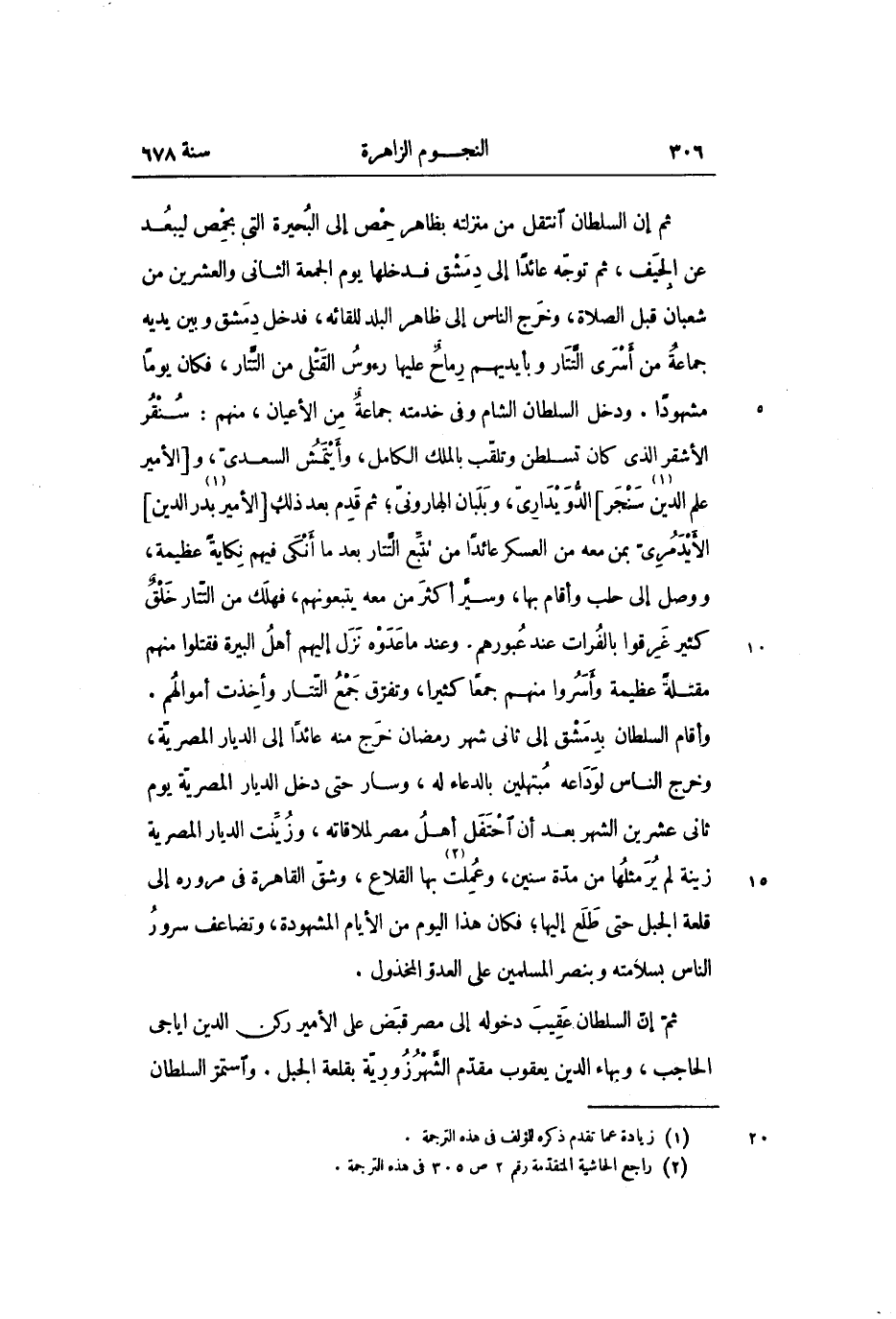 وأقام السلطان بدمشق إلى ثانى شهر رمضان خرج منه عائدا إلى الديار المصريّة، وخرج الناس لوداعه مبتهلين بالدعاء له، وسار حتى دخل الديار المصريّة يوم ثانى عشرين الشهر بعد أن احتفل أهل مصر لملاقاته، وزيّنت الديار المصرية زينة لم ير مثلها من مدّة سنين، وعملت «3» بها القلاع، وشقّ القاهرة فى مروره إلى قلعة الجبل حتى طلع إليها؛ فكان هذا اليوم من الأيام المشهودة، وتضاعف سرور الناس بسلامته وبنصر المسلمين على العدوّ المخذول.