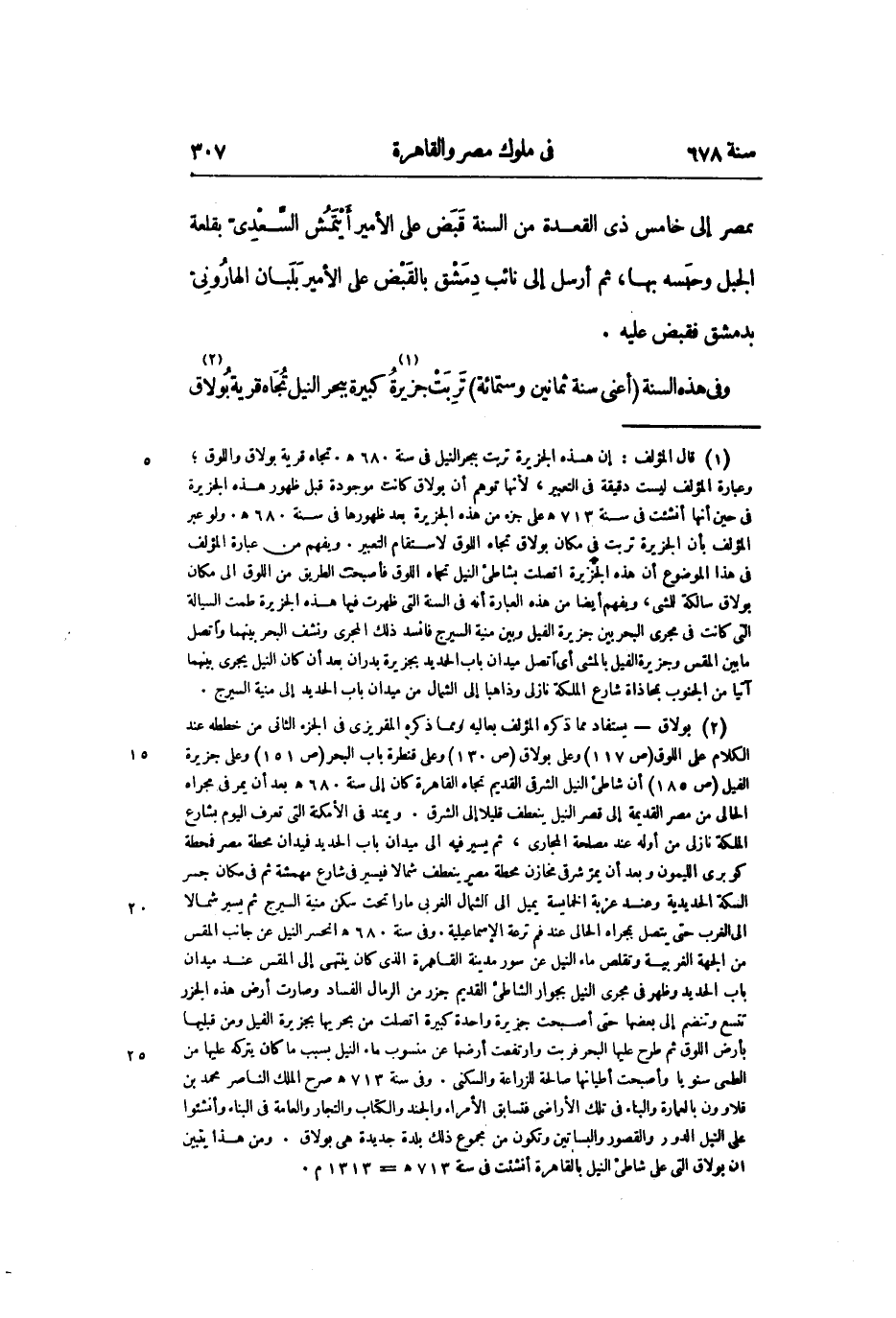 وفى هذه السنة (أعنى سنة ثمانين وستمائة) تربت جزيرة «1» كبيرة ببحر النيل تجاه قرية بولاق «2»