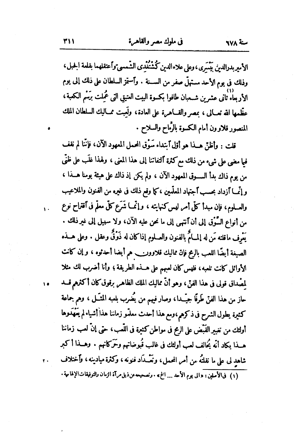 قلت: وأظنّ هذا هو أوّل ابتداء سوق المحمل المعهود الآن، فإنّنا لم نقف فيما مضى على شىء من ذلك مع كثرة التفاتنا إلى هذا المعنى، ولهذا غلب على ظنّى من يوم ذاك بدأ السوق المعهود الآن، ولم يكن إذ ذاك على هيئة يومنا هذا، وإنّما ازداد بحسب اجتهاد المعلّمين، كما وقع ذلك فى غيره من الفنون والملاعيب والعلوم، فإن مبدأ كلّ أمر ليس كنهايته، وإنّما شرع كلّ معلّم فى اقتراح نوع من أنواع السّوق إلى أن انتهى إلى ما نحن عليه الآن، ولا سبيل إلى غير ذلك.