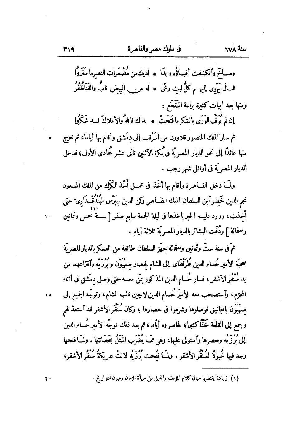 ثم سار الملك المنصور قلاوون من المرقب إلى دمشق وأقام بها أياما، ثم خرج منها عائدا إلى نحو الديار المصريّة فى بكرة الاثنين ثانى عشر جمادى الأولى؛ فدخل الديار المصريّة فى أوائل شهر رجب.