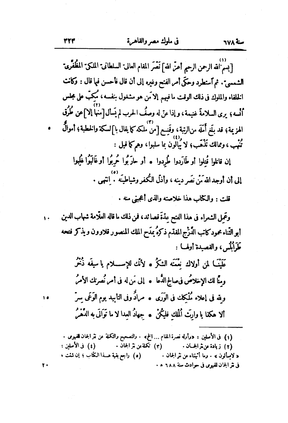 [بسم «1» الله الرحمن الرحيم أعزّ الله] نصر المقام العالىّ السلطانىّ الملكىّ المظفّرىّ الشمسىّ. ثم استطرد وحكى أمر الفتح وغيره إلى أن قال فأحسن فيما قال: وكانت الخلفاء والملوك فى ذلك الوقت ما فيهم إلا من هو مشغول بنفسه، مكبّ على مجلس أنسه؛ يرى السلامة غنيمة، وإذا عنّ له وصف الحرب لم يسأل [منها «2» إلا] عن طرق الهزيمة؛ قد بلغ أمله من الرتبة، وقنع [من «3» ملكه كما يقال با] لسكة والخطبة؛ أموال تنهب، وممالك تذهب؛ لا يبالون «4» بما سلبوا، وهم كما قيل: