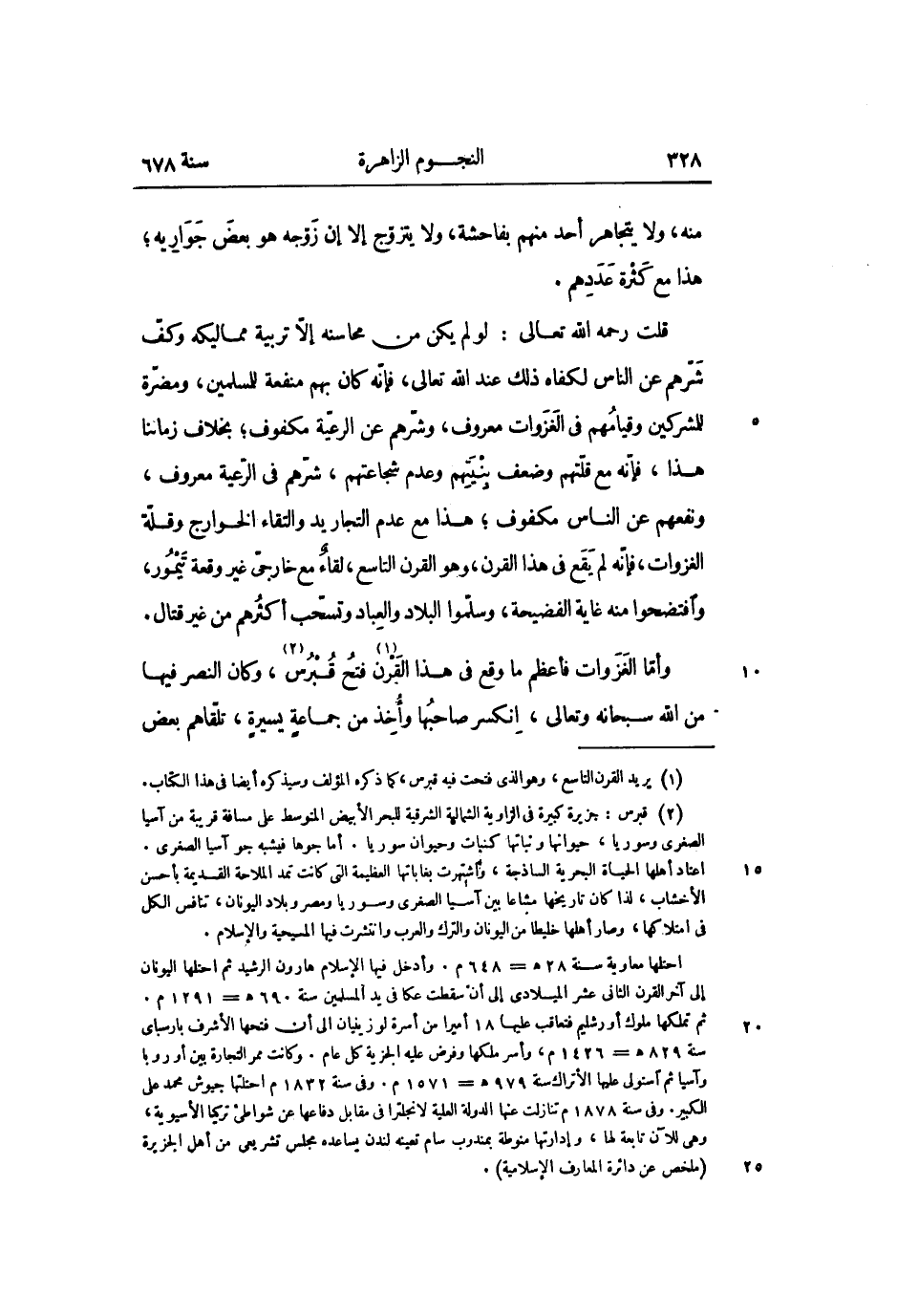 وأمّا الغزوات فأعظم ما وقع فى هذا القرن «1» فتح قبرس «2» ، وكان النصر فيها من الله سبحانه وتعالى، انكسر صاحبها وأخذ من جماعة يسيرة، تلقّاهم بعض
