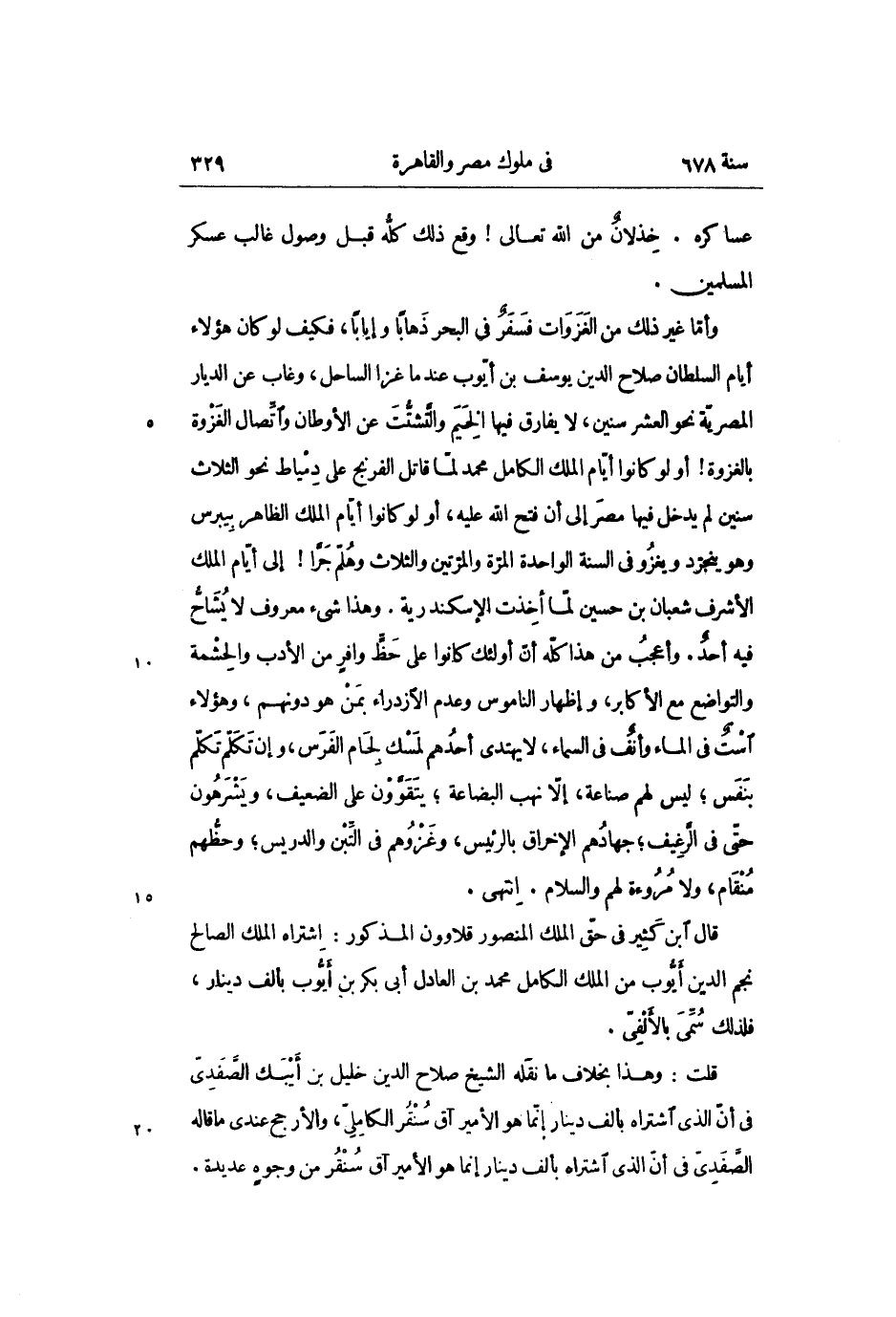 وأمّا غير ذلك من الغزوات فسفر فى البحر ذهابا وإيابا، فكيف لو كان هؤلاء أيام السلطان صلاح الدين يوسف بن أيّوب عند ما غزا الساحل، وغاب عن الديار المصريّة نحو العشر سنين، لا يفارق فيها الخيم والتّشتّت عن الأوطان واتّصال الغزوة بالغزوة! أو لو كانوا أيّام الملك الكامل محمد لمّا قاتل الفرنج على دمياط نحو الثلاث سنين لم يدخل فيها مصر إلى أن فتح الله عليه، أو لو كانوا أيّام الملك الظاهر بيبرس وهو يتجرّد ويغزو فى السنة الواحدة المرّة والمرّتين والثلاث وهلمّ جرّا! إلى أيّام الملك الأشرف شعبان بن حسين لمّا أخذت الإسكندرية. وهذا شىء معروف لا يشاحّ فيه أحد. وأعجب من هذا كلّه أنّ أولئك كانوا على حظّ وافر من الأدب والحشمة والتواضع مع الأكابر، وإظهار الناموس وعدم الازدراء بمن هو دونهم، وهؤلاء است فى الماء وأنف فى السماء، لا يهتدى أحدهم لمسك لجام الفرس، وإن تكلّم تكلّم بنفس؛ ليس لهم صناعة، إلّا نهب البضاعة؛ يتقوّون على الضعيف، ويشرهون حتّى فى الرّغيف؛ جهادهم الإخراق بالرئيس، وغزوهم فى التّبن والدريس؛ وحظّهم منقام، ولا مروءة لهم والسلام. انتهى.