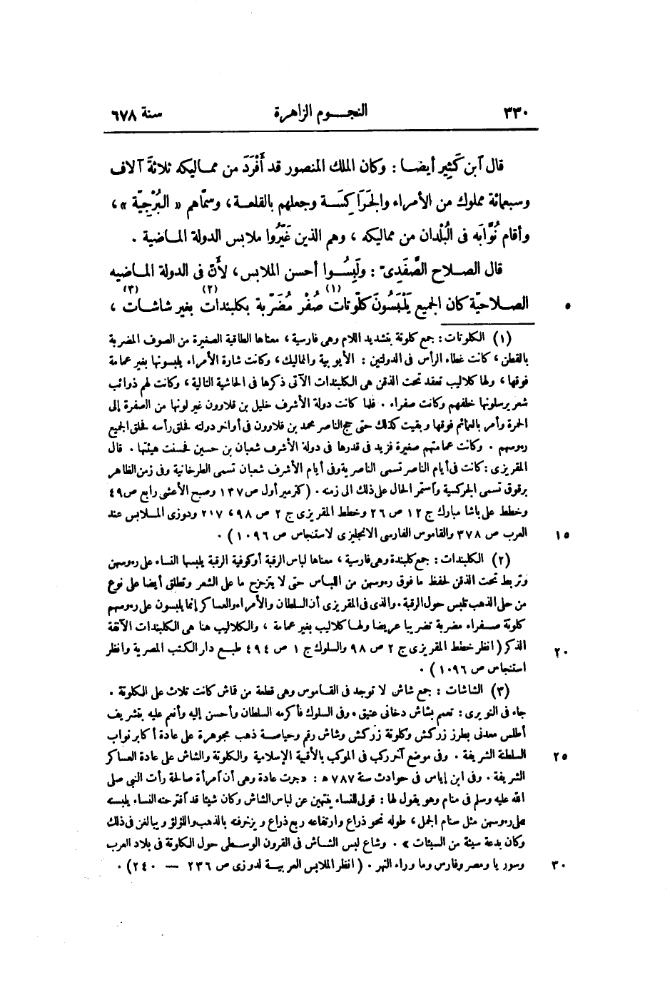 قال الصلاح الصّفدىّ: ولبسوا أحسن الملابس، لأنّ فى الدولة الماضية الصلاحيّة كان الجميع يلبسون كلّوتات «1» صفر مضرّبة بكلبندات «2» بغير شاشات «3» ،