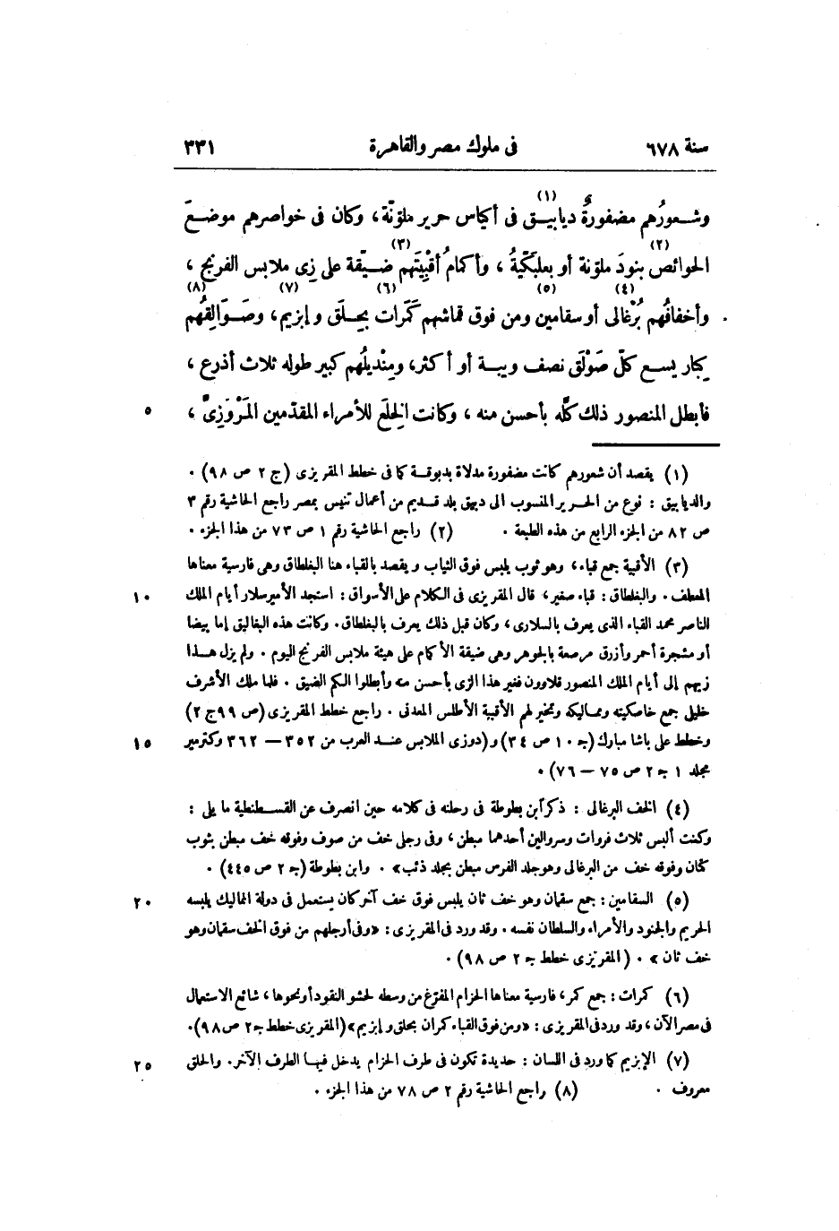 وشعورهم مضفورة ديابيق «1» فى أكياس حرير ملوّنة، وكان فى خواصرهم موضع الحوائص «2» بنود ملوّنة أو بعلبكّية، وأكمام أقبيتهم «3» ضيّقة على زى ملابس الفرنج، وأخفافهم برغالى «4» أو سقامين «5» ومن فوق قماشهم كمرات «6» بحلق وإبزيم «7» ، وصوالقهم «8» كبار يسع كلّ صولق نصف ويبة أو أكثر، ومنديلهم كبير طوله ثلاث أذرع، فأبطل المنصور ذلك كلّه بأحسن منه، وكانت الخلع للأمراء المقدّمين المروزىّ،