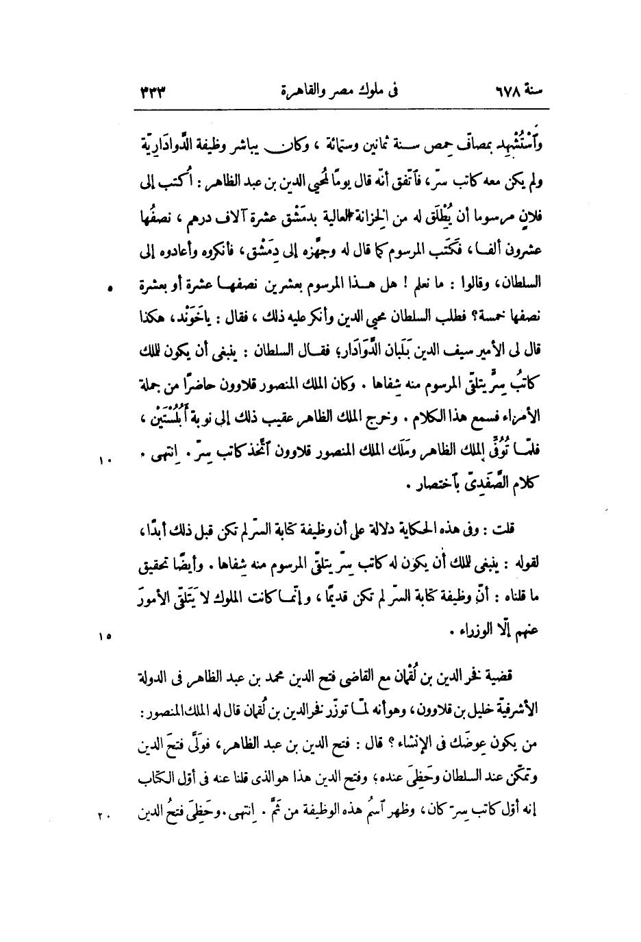 قلت: وفى هذه الحكاية دلالة على أن وظيفة كتابة السرّ لم تكن قبل ذلك أبدا، لقوله: ينبغى للملك أن يكون له كاتب سرّ يتلقّى المرسوم منه شفاها. وأيضا تحقيق ما قلناه: أنّ وظيفة كتابة السرّ لم تكن قديما، وإنّما كانت الملوك لا يتلقّى الأمور عنهم إلّا الوزراء.