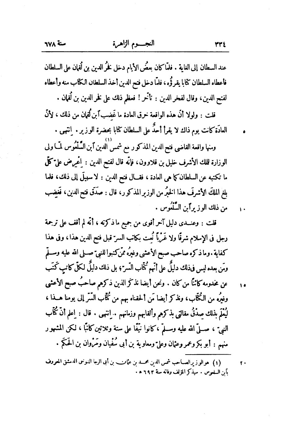 ومنها واقعة القاضى فتح الدين المذكور مع شمس «1» الدين ابن السّلعوس لمّا ولى الوزارة للملك الأشرف خليل بن قلاوون، فإنّه قال لفتح الدين: اعرض علىّ كلّ ما تكتبه عن السلطان كما هى العادة، فقال فتح الدين: لا سبيل إلى ذلك، فلما بلغ الملك الأشرف هذا الخبر من الوزير المذكور، قال: صدق فتح الدين، فغضب من ذلك الوزير ابن السّلعوس.