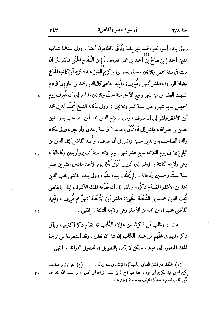 أحمد بن عمر المعروف با] بن السّفاح الحلبى فباشر إلى أن مات فى سنة خمس وثلاثين. وولى بعده الوزير كريم «2» الدين عبد الكريم ابن كاتب المناخ مضافا للوزارة، فباشر أشهرا وصرف؛ وأعيد القاضى كمال الدين محمد بن البارزىّ فى يوم السبت العشرين من شهر ربيع الآخر سنة ستّ وثلاثين، فباشر إلى أن صرف يوم الخميس سابع شهر رجب سنة تسع وثلاثين؛ وولى مكانه الشيخ محبّ الدين محمد ابن الأشقر فباشر إلى أن صرف، وولى صلاح الدين محمد ابن الصاحب بدر الدين حسن بن نصر الله، فباشر إلى أن توفّى بالطاعون فى سنة إحدى وأربعين، وولى مكانه والده الصاحب بدر الدين حسن فباشر إلى أن صرف، وأعيد القاضى كمال الدين بن البارزىّ فى يوم الثلاثاء سابع عشر شهر ربيع الآخر سنة اثنتين وأربعين وثمانمائة، وهى ولايته الثالثة؛ فباشر إلى أن توفّى بكرة يوم الأحد سادس عشرين صفر سنة ستّ وخمسين وثمانمائة. ولم يخلّف بعده مثله، وولى بعده القاضى محب الدين محمد بن الأشقر المقدّم ذكره، وباشر إلى أن صرفه الملك الأشرف إينال بالقاضى محب الدين محمد بن الشّحنة الحلبىّ، فباشر ابن الشّحنة أشهرا ثم صرف، وأعيد القاضى محب الدين محمد بن الأشقر وهى ولايته الثالثة. انتهى.