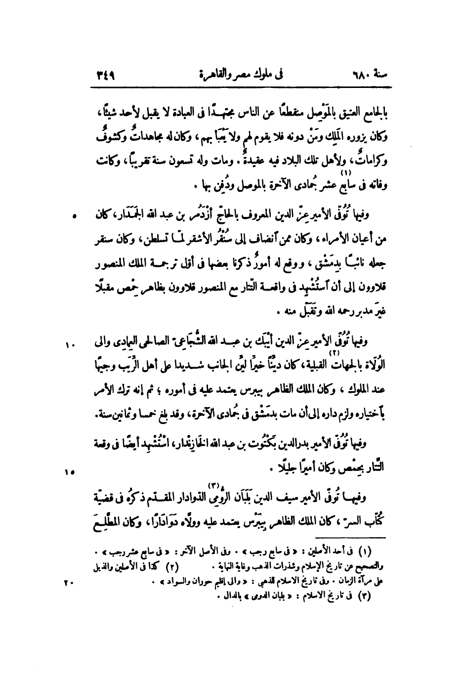 وفيها توفّى الأمير عزّ الدين المعروف بالحاجّ أزدمر بن عبد الله الجمدار، كان من أعيان الأمراء، وكان ممن انضاف إلى سنقر الأشقر لمّا تسلطن، وكان سنقر جعله نائبا بدمشق، ووقع له أمور ذكرنا بعضها فى أوّل ترجمة الملك المنصور قلاوون إلى أن استشهد فى واقعة التّتار مع المنصور قلاوون بظاهر حمص مقبلا غير مدبر رحمه الله وتقبّل منه.