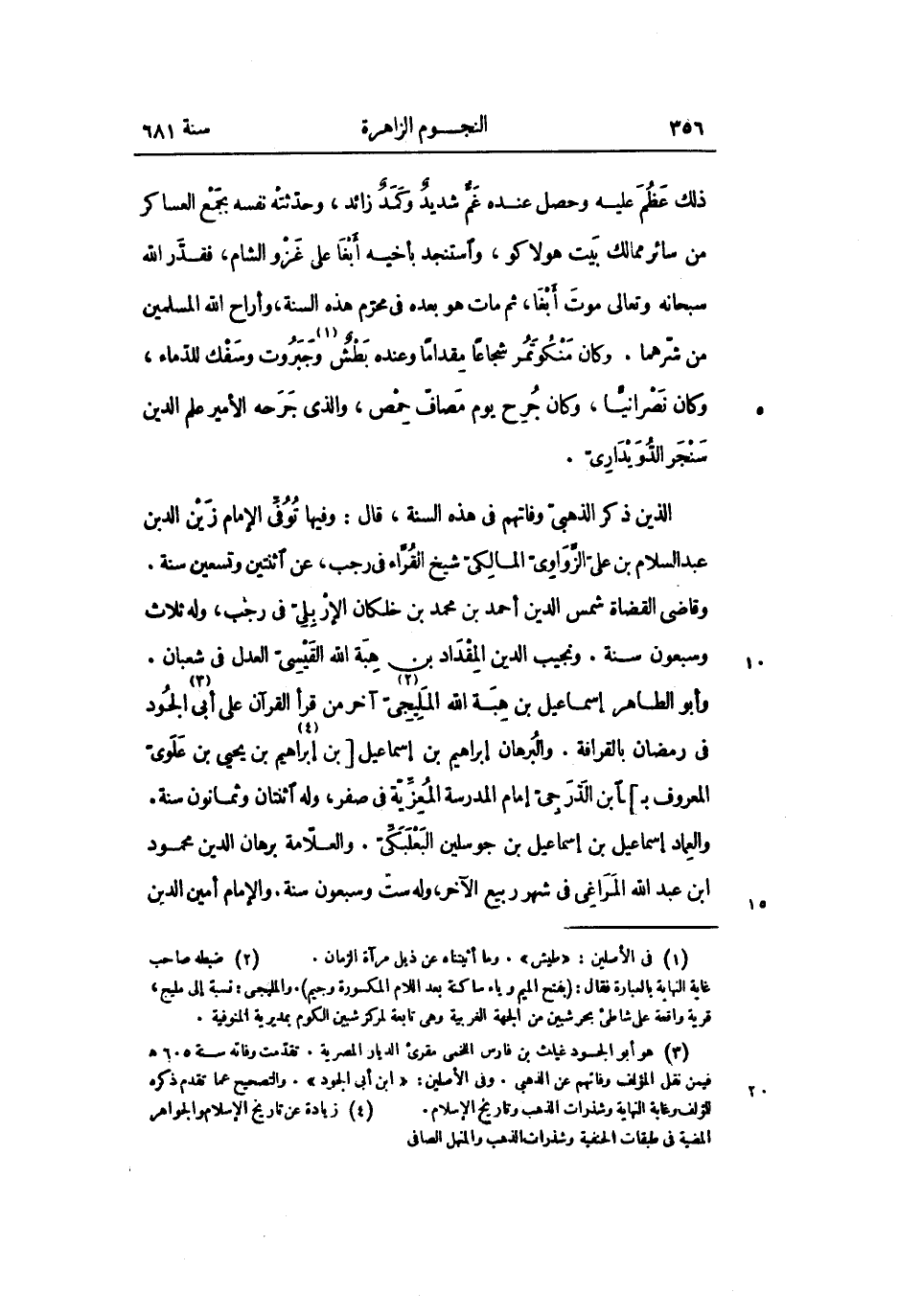 ذلك عظم عليه وحصل عنده غمّ شديد وكمد زائد، وحدّثته نفسه بجمع العساكر من سائر ممالك بيت هولاكو، واستنجد بأخيه أبغا على غزو الشام، فقدّر الله سبحانه وتعالى موت أبغا، ثم مات هو بعده فى محرّم هذه السنة، وأراح الله المسلمين من شرّهما. وكان منكوتمر شجاعا مقداما وعنده بطش «1» وجبروت وسفك للدّماء، وكان نصرانيّا، وكان جرح يوم مصافّ حمص، والذي جرحه الأمير علم الدين سنجر الدّويدارىّ.