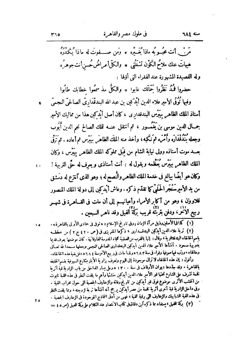 وفيها توفّى الأمير علاء الدين أيدكين بن عبد الله البندقدارىّ الصالحىّ النجمىّ أستاذ الملك الظاهر بيبرس البندقدارى، كان أصل أيدكين هذا من مماليك الأمير جمال الدين موسى بن يغمور، ثم انتقل عنه للملك الصالح نجم الدين أيّوب وجعله بندقداره وأمّره ثم نكبه، وأخذ منه الملك الظاهر بيبرس ثم أعاده. ثم ترقّى بعد موت أستاذه وولى نيابة الشام من قبل مملوكه الملك الظاهر بيبرس، وكان الملك الظاهر بيبرس يعظّمه ويقول له: أنت أستاذى ويعرف له حقّ التربية! وكان هو أيضا يبالغ فى خدمة الملك الظاهر والنّصح له؛ وهو الذي انتزع له دمشق من يد الأمير سنجر الحلبىّ كما تقدّم ذكره. وعاش أيدكين إلى دولة الملك المنصور قلاوون، وهو من أكابر الأمراء وأعيانهم إلى أن مات فى القاهرة فى شهر ربيع الاخر «1» ، ودفن بتربته «2» قريب بركة «3» الفيل وقد ناهر السبعين.