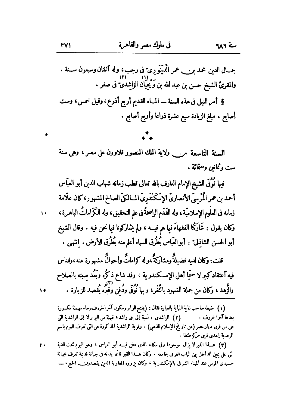 فيها توفّى الشيخ الإمام العارف بالله تعالى قطب زمانه شهاب الدين أبو العبّاس أحمد بن عمر المرسىّ الأنصارىّ الإسكندرىّ المالكىّ الصالح المشهور، كان علّامة زمانه فى العلوم الإسلاميّة، وله القدم الراسخة فى علم التحقيق، وله الكرامات الباهرة، وكان يقول: شاركنا الفقهاء فيما هم فيه، ولم يشاركونا فيما نحن فيه. وقال الشيخ أبو الحسن الشاذلىّ: أبو العبّاس بطرق السماء أعلم منه بطرق الأرض. انتهى.